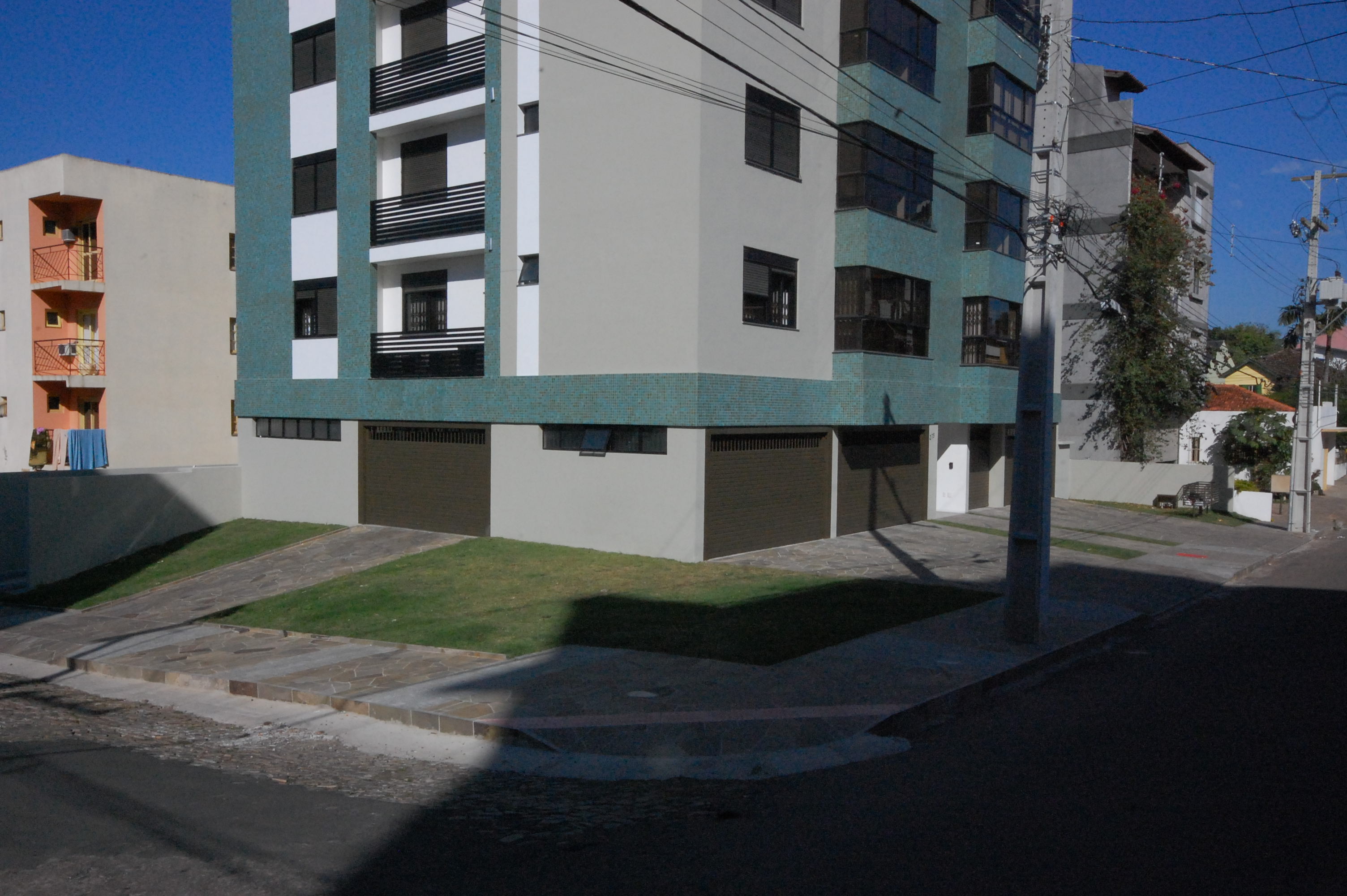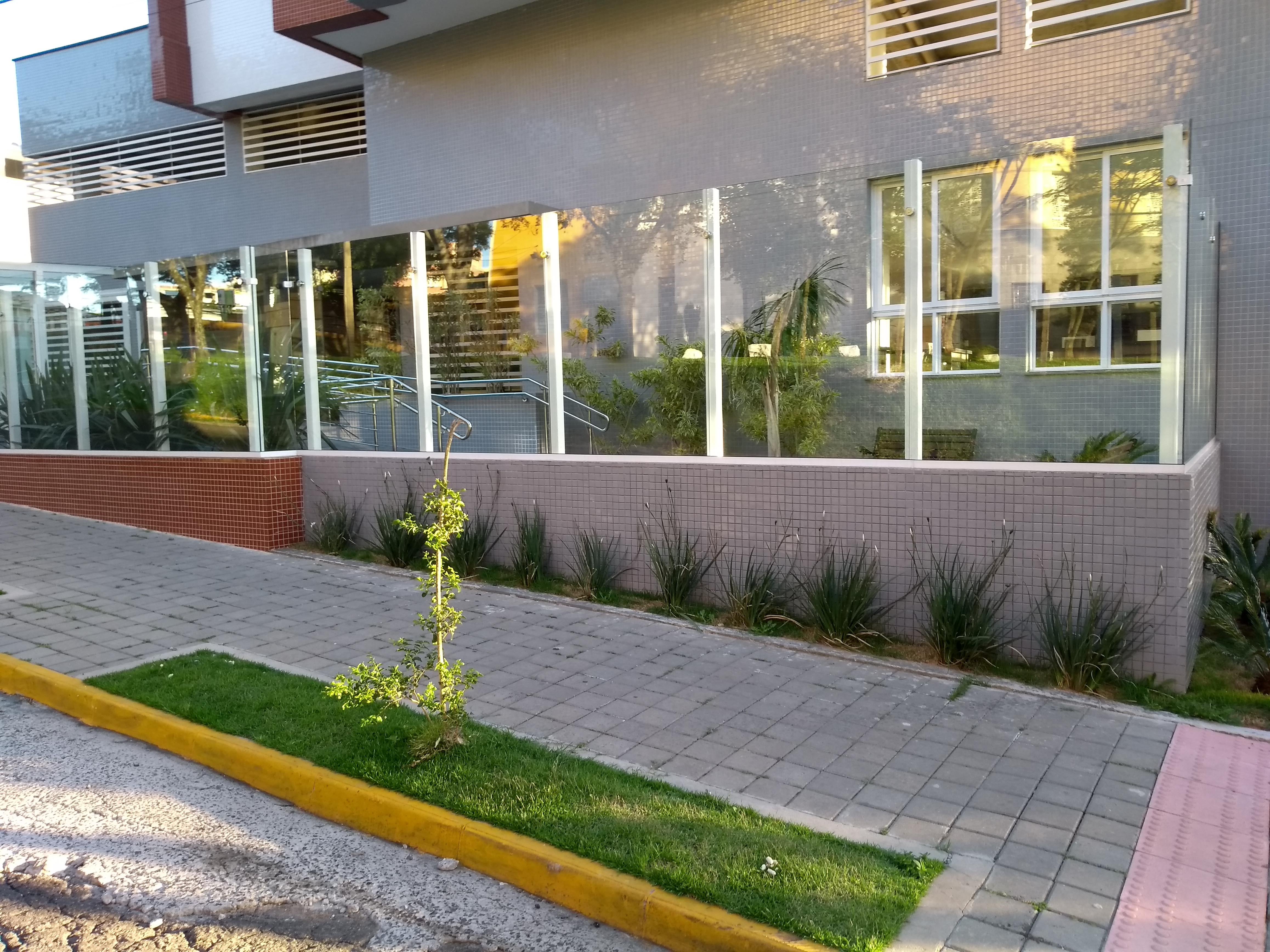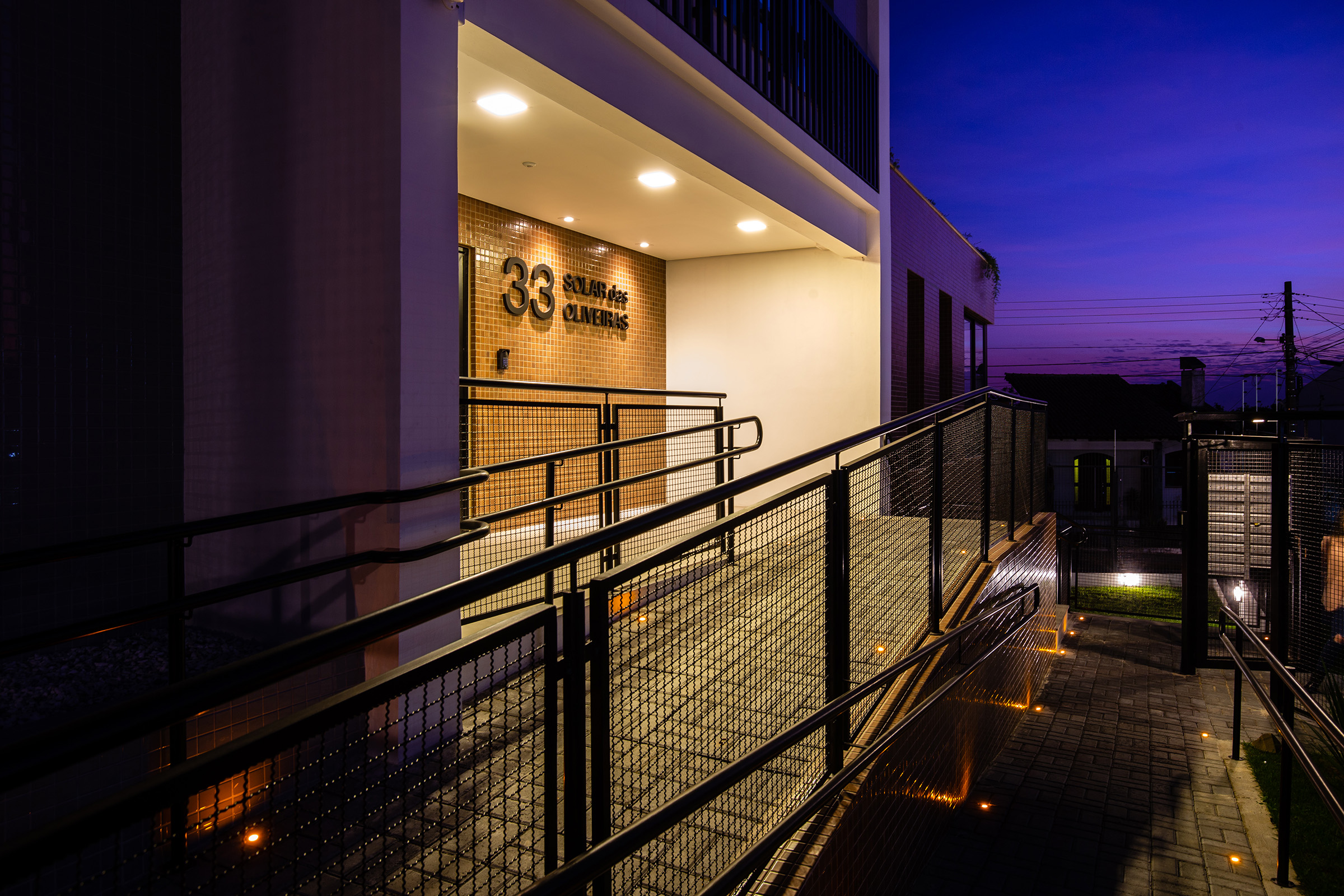 Essas experiência de projeto têm sido levadas para os nossos projetos de edifícios. Hoje já deixamos projeto de fechamento de lote pronto para ser executado pelos futuros moradores, ou ainda viabilizamos uma maneira mais barata (junto com o incorporador) de já fechar o lote antes da entrega do empreendimento. Foi o caso do Residencial Solar das Oliveiras, entregue fechado, mesmo com a edificação em um terreno de esquina (o custo é mais alto devido à grande testada). O fechamento cria um pátio, protege o salão de festas e a rampa de acesso, sem interferir no fechamento dos portões de acesso às garagens, parte mais onerosa, devido aos portões. Aproveitamos e já deixamos separados também os medidores de energia e central de gás, não necessitando assim que prestadores de serviço entrem no pátio.