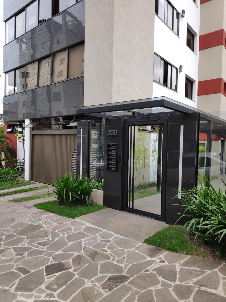No residencial Guilherme Cassel, a ideia central era dar proteção para a chuva, desde o portão de acesso da calçada até o prédio, e atualizar e marcar visualmente o acesso, que, por relato dos moradores, muitas vezes não era percebido como acesso da edificação. Um dos pontos principais para criar a identificação do acesso foi recuar o fechamento do lote, deslocando ele do alinhamento da edificação vizinha. Outra estratégia foi propor um revestimento semelhante ao utilizado no prédio (um revestimento 20 cm x 20 cm preto), a partir da utilização de um porcelanato Eliane preto polido 60 cm x 60 cm. Esse revestimento foi utilizado de maneira modular e semelhante aos existentes na edificação, criando relação visual entre edificação e acesso. Para completar, a cobertura e fechamento de vidro dão transparência, leveza e contemporaneidade ao acesso. No fim, o projeto cria uma passarela para o transeunte acessar a edificação, ladeada por um ambiente de estar.