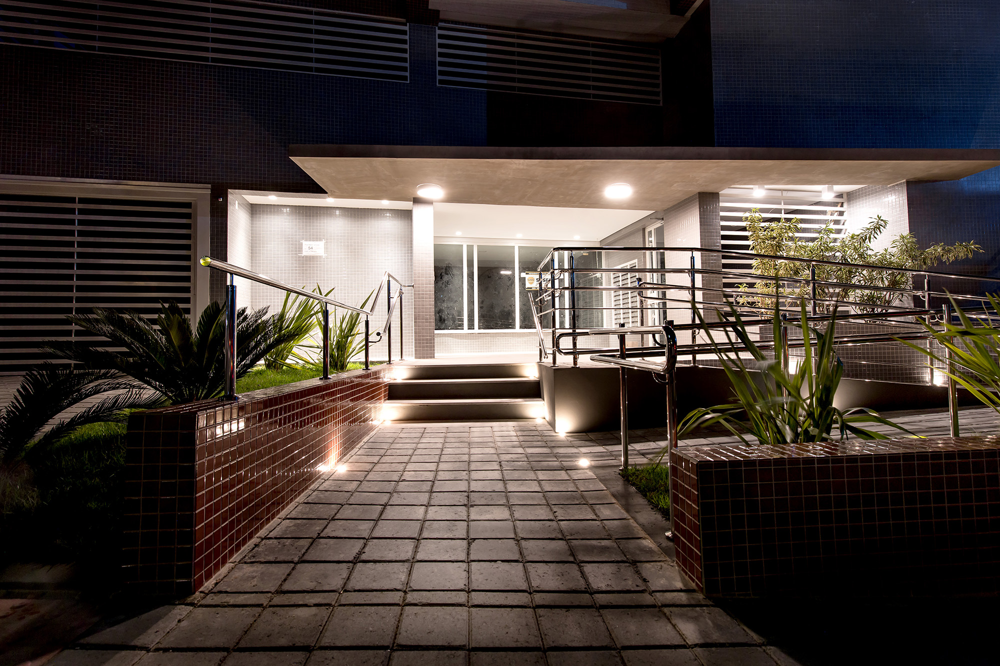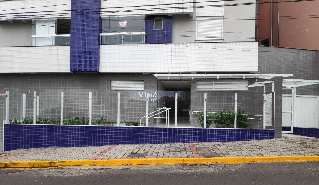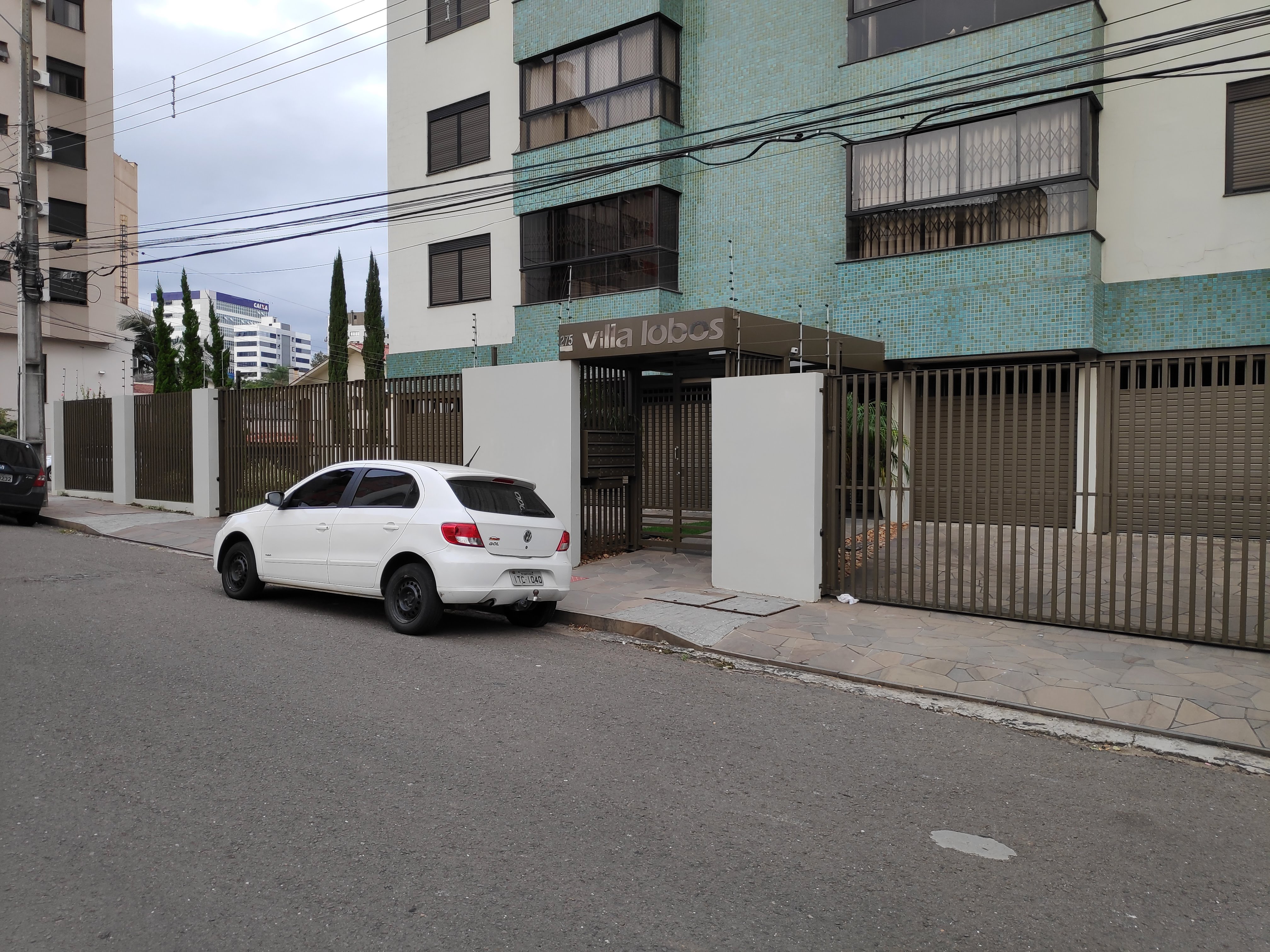 O residencial Villa-lobos, localizado próximo à saída da garagem do shopping Royal Plaza, possui 9 pavimentos com 2 apartamentos em cada. A edificação foi entregue sem fechamento do lote, o que logo foi requisitado pelo síndico e novos moradores. Quando iniciamos o projeto, a opção foi manter a linha de acesso original, trabalhando o fechamento do lote com elementos de alvenaria intercalados com grades tubulares na vertical, dialogando com o desenho de piso da calçada. As grades na vertical criam ritmo e dificultam a escalada. Uma cobertura metálica e em vidro liga o acesso do edifício ao novo portão externo, recuado do alinhamento da calçada, protegendo quem espera na chuva e criando espaço para as caixas de correspondências, sem interferência no passeio público.