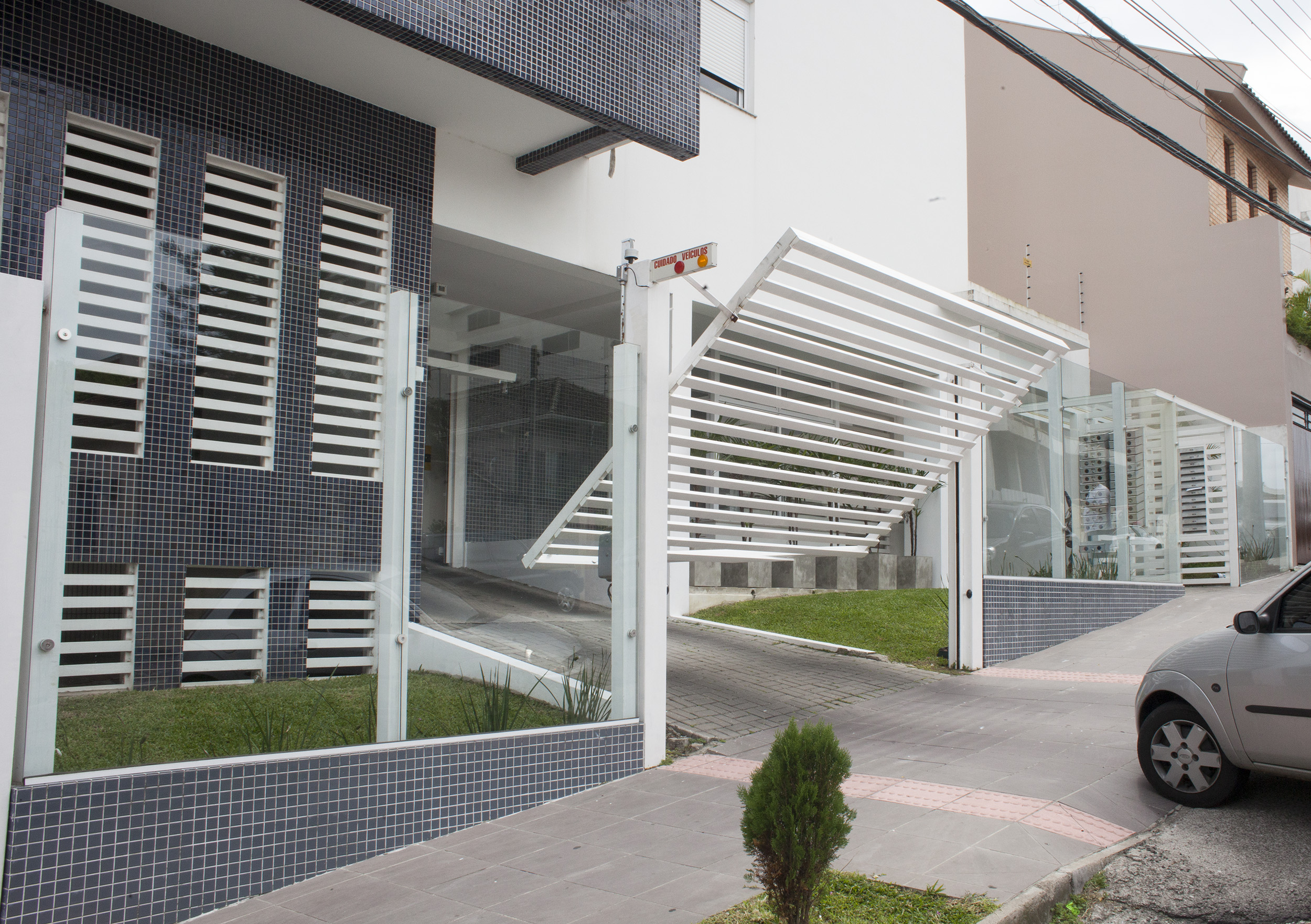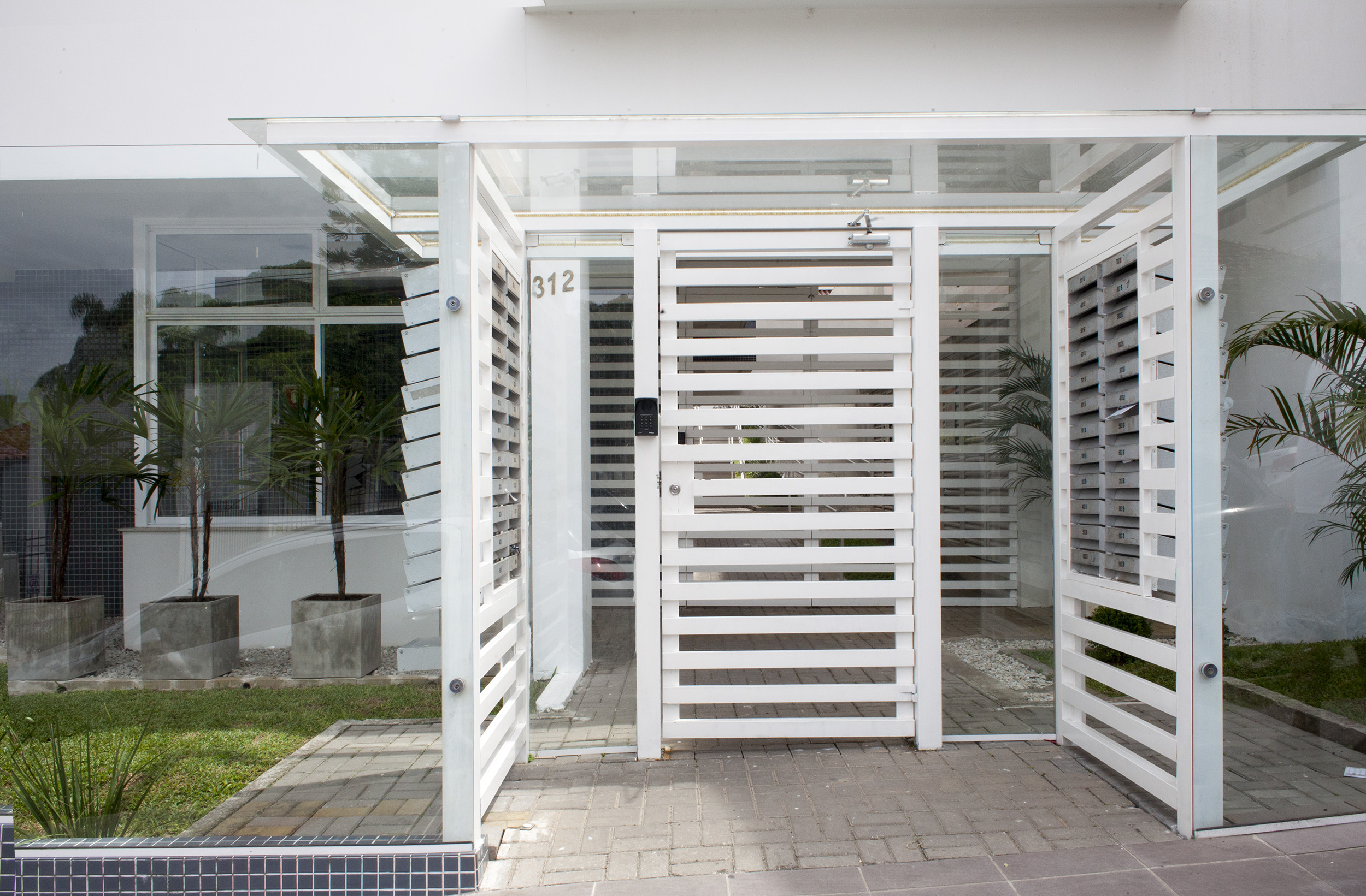 O residencial Olavo Bilac foi nosso primeiro projeto de edifício multifamiliar, no qual foi previsto um portão de acesso e um espaço destinado a guarita, para portaria, mas por redução de custo não foram feitos os fechamentos do lote. Fomos chamados para modificar o acesso pelo primeiro síndico do prédio. A ideia era ampliar o pátio e criar um espaço de segurança, colocando um segundo portão nos dois acessos de garagem e no acesso de pedestres. A opção de fechamento foi o vidro, que da mais transparência e leveza no visual. Novamente, um recuo com cobertura e espaço para as caixas de correspondências foi criado. Veja o edifício pronto no nosso site.