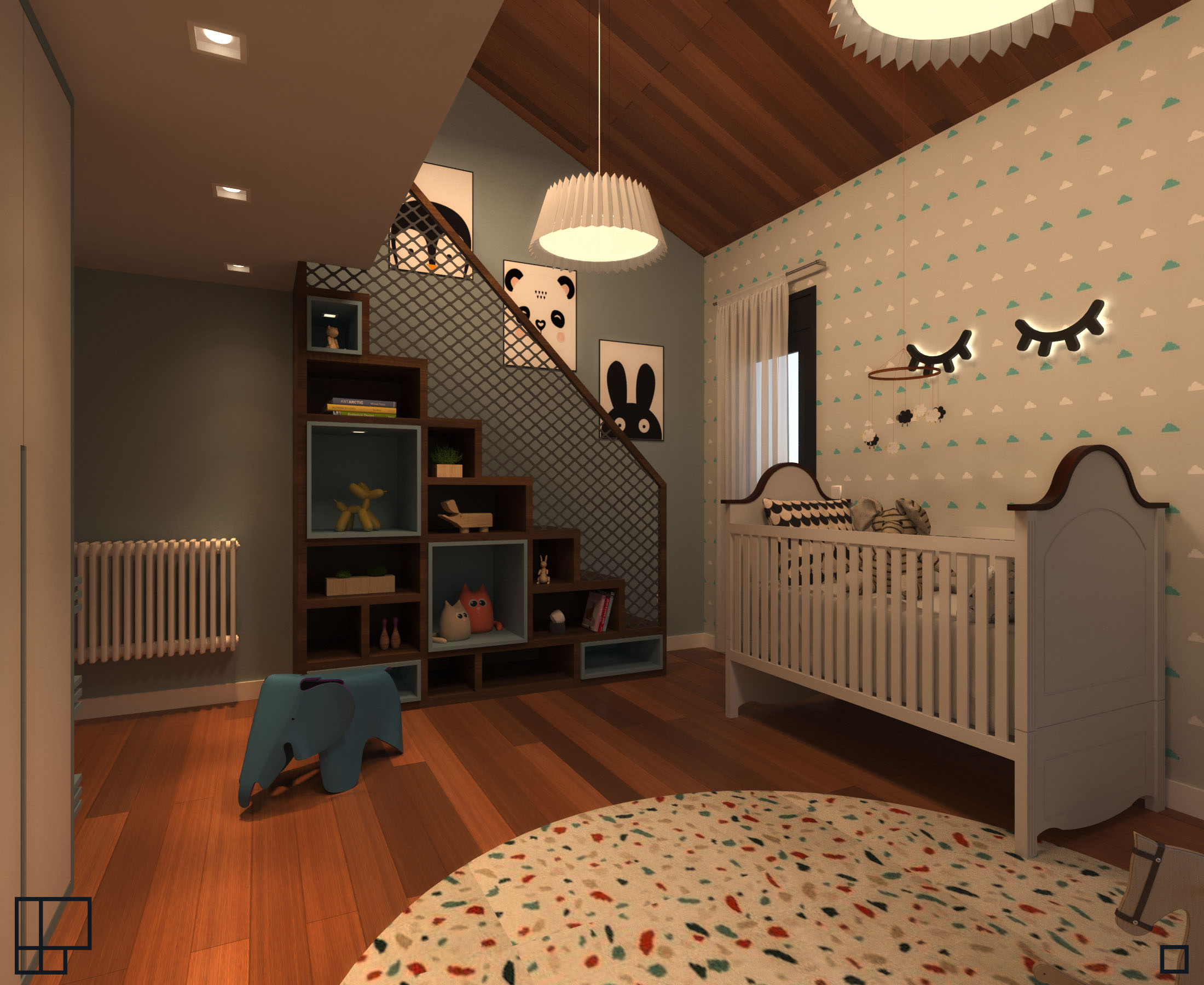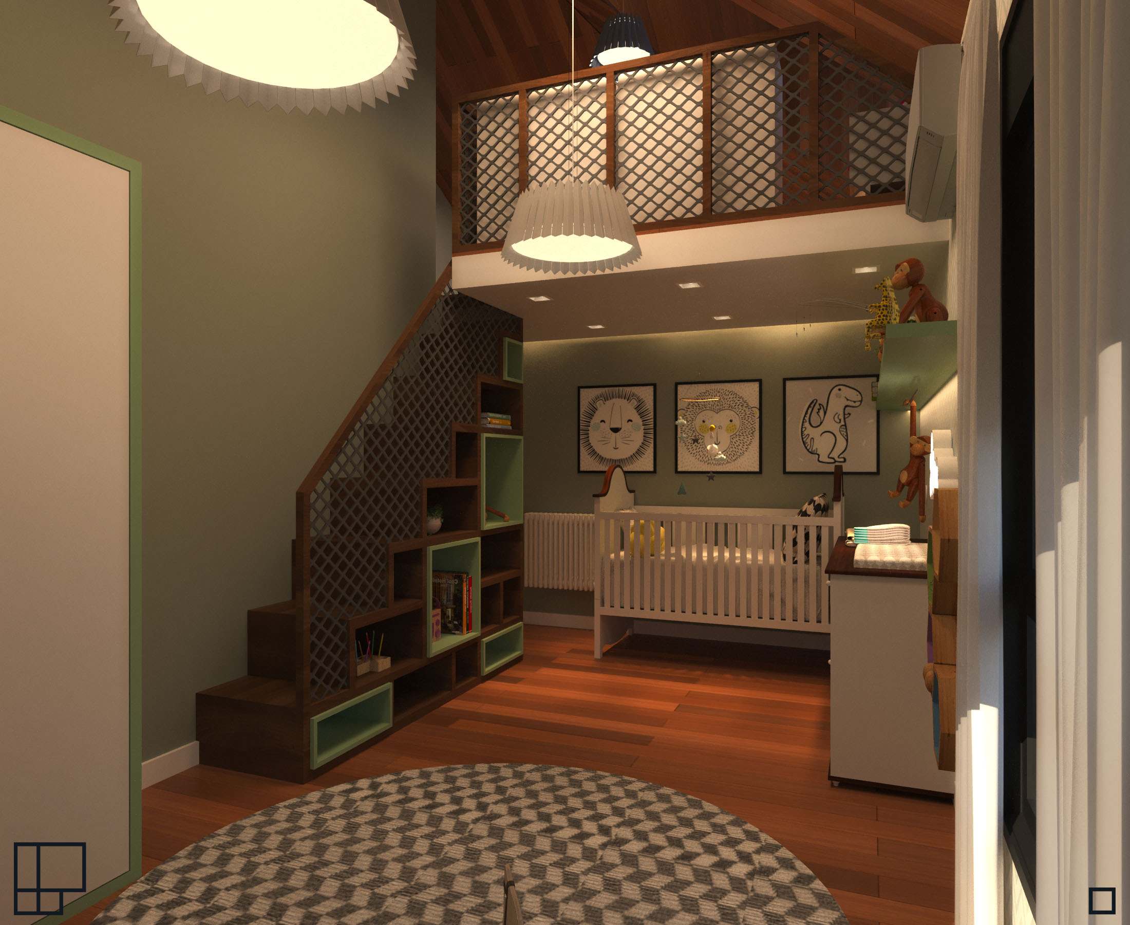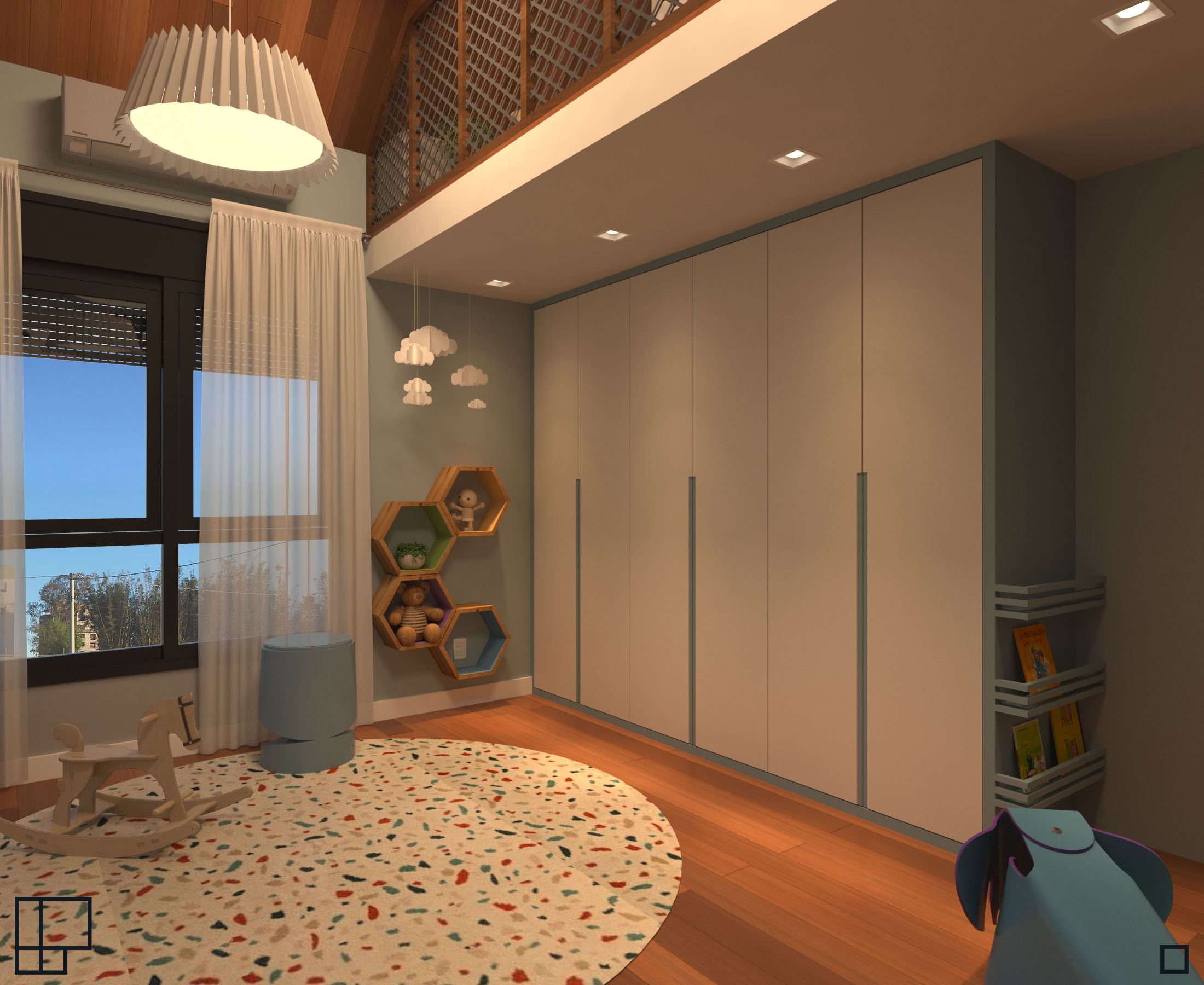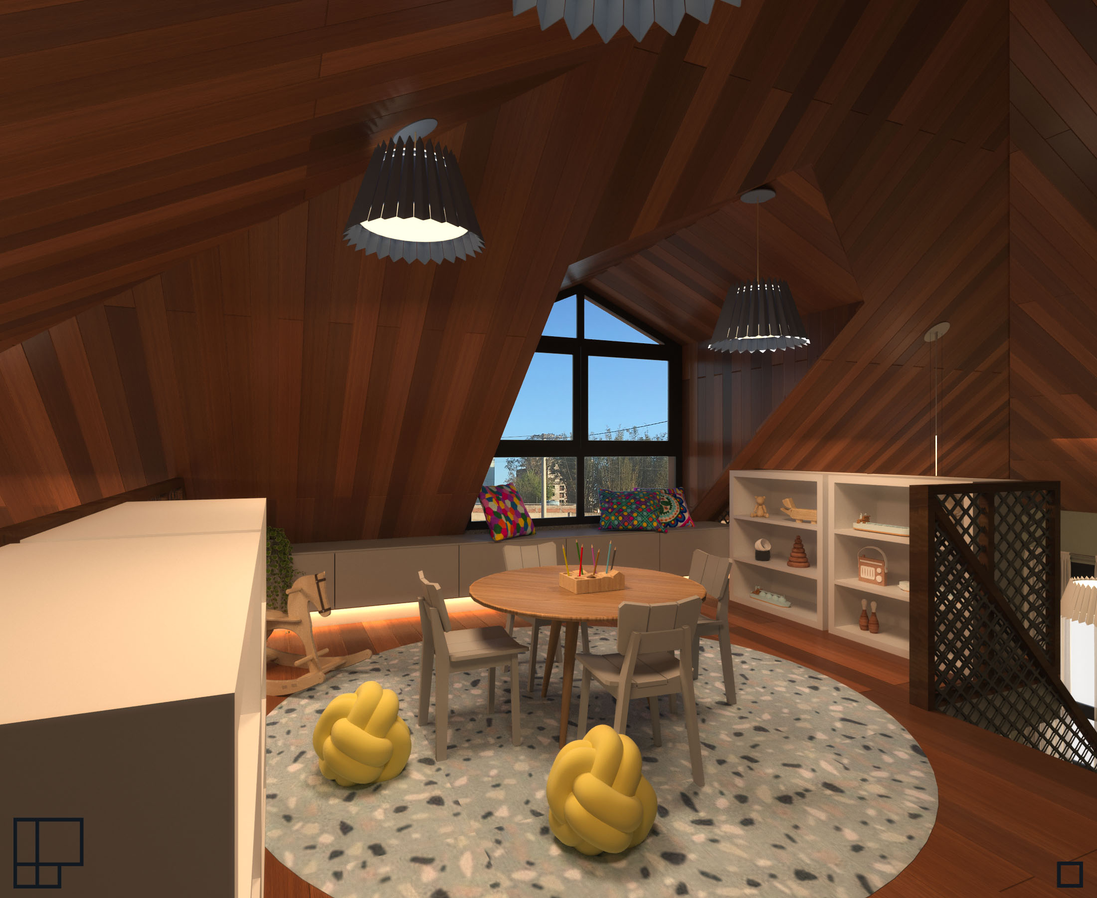Um ponto pertinente da discussão do projeto, desde o início, foi sobre a utilização de telhado com alta inclinação, um desejo dos clientes, e que não poderia ser ignorado. O projeto acabou tirando partido desta inclinação, apropriando-se da mesma para qualificação da espacialidade da residência. O resultado foi um projeto no qual o telhado, talvez o elemento com maior aparição no imaginário coletivo nacional quando o assunto é casa, ficasse aparente também dentro da residência, não sendo somente um fator estético externo. Assim, a sala de estar com pé-direito duplo, junto com o mezanino (estar íntimo), possuem o forro de madeira inclinado, criando um espaço que gera curiosidade e descoberta. No ambiente onde ficam os dormitórios das duas filhas, a inclinação do telhado foi utilizada para criar um outro mezanino dos dormitórios, uma sala que gera uma espécie de esconderijo das duas irmãs. Esse espaço, acessado somente pelos dormitórios delas, possui o pé direito inclinado e variável, configura-se como um ambiente compartilhado que as irmãs vão poder construir seus usos juntas.