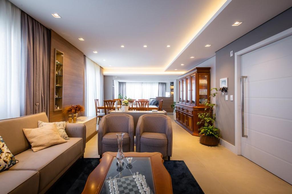 O Apartamento Veza fica dentro do Tom Jobim, mais uma possibilidade de modificar um projeto nosso, e para clientes mais que especiais. O casal de descendentes de italianos viviam em volta da cozinha, e por isso decidimos criar um estar junto à cozinha, integrando os dois ambientes, e aumentando o convívio em volta do espaço que se faz a comida. O apartamento é cheio de lembrança e história, como o jogo de mobiliário do jantar e a prataria que adorna a cozinha e funciona para servir o café. Coube a nós respeitar e valorizar essa história.