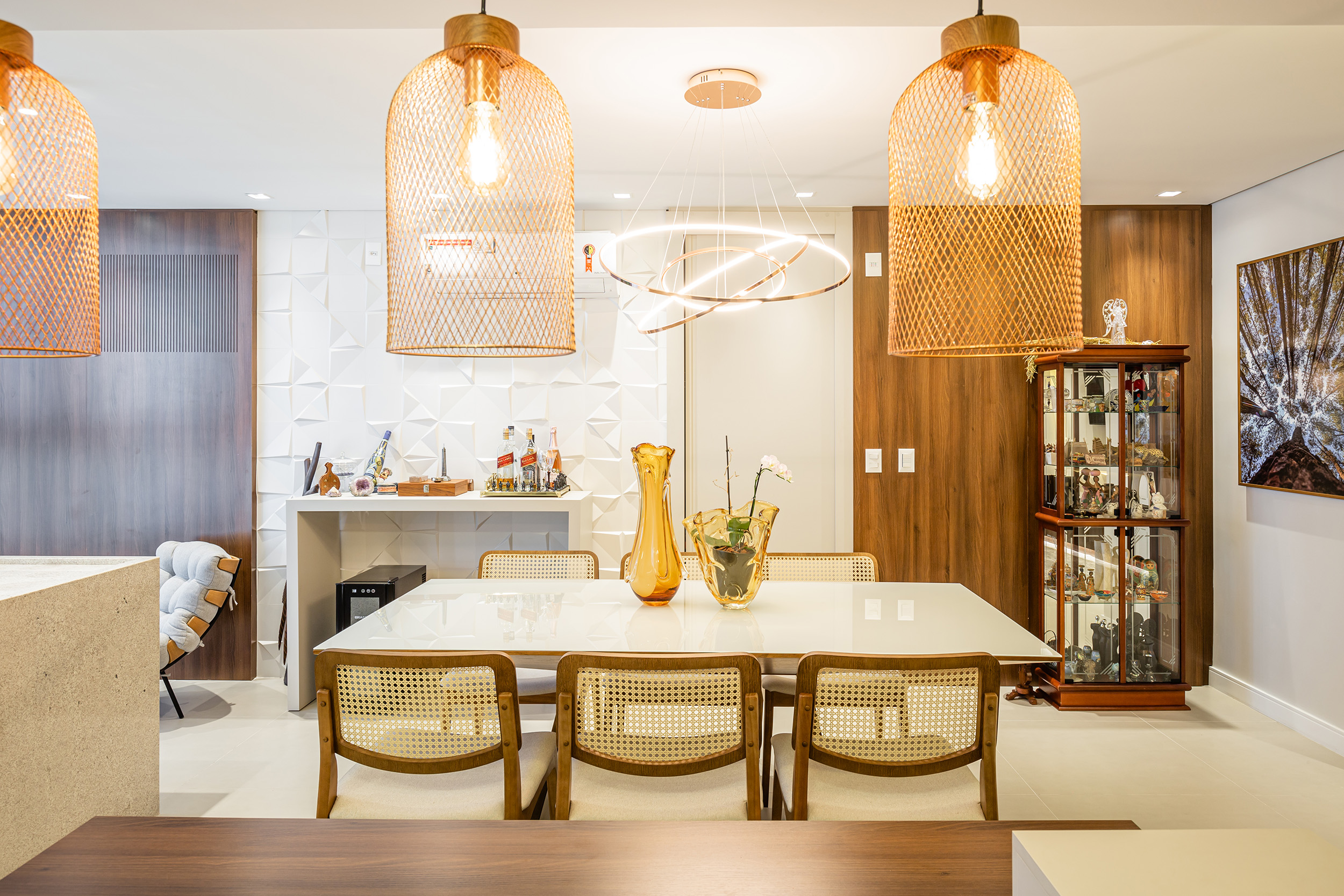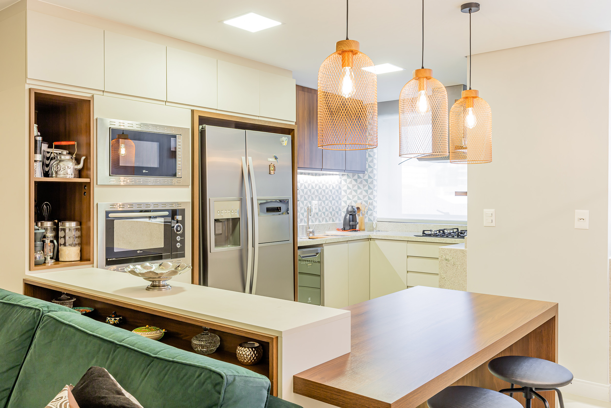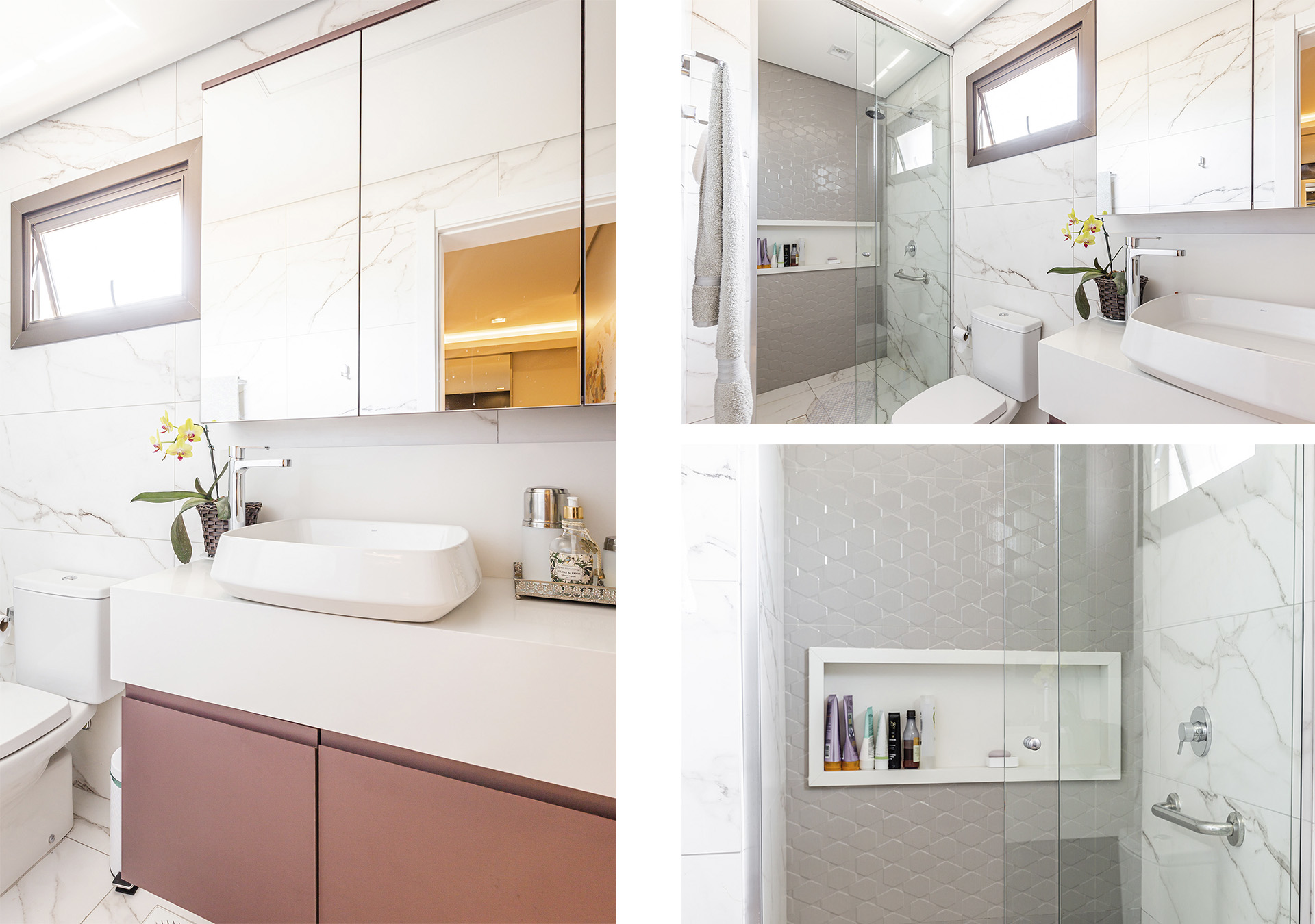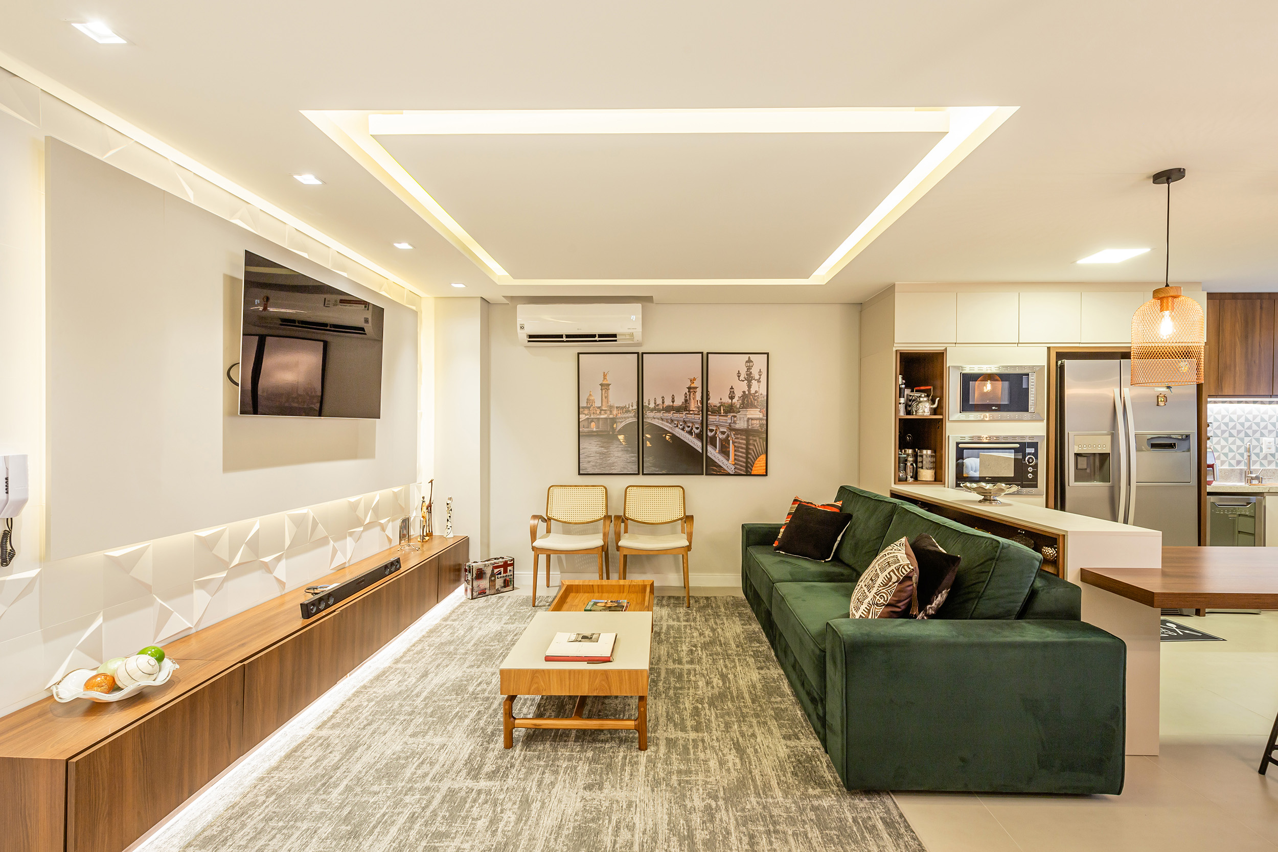 O banheiro da 3° suíte, a que foi suprimida, foi transformado em lavanderia, assim a lavanderia fica perto dos dormitórios e em posição central da casa, facilitando a limpeza e o fluxo de lavagem de roupas, que saem do quarto/banheiro para a lavanderia. Essa mudança também permitiu que a cozinha fosse ampliada e tivesse ventilação natural, o que não era possível no projeto anterior. Por fim, a sacada foi integrada à sala, ampliando ainda mais o espaço social, que ganhou segmentação por mobiliário. É o mobiliário que define onde são os usos. Outro detalhe é o painel madeirado, que deixa discreto o acesso à área íntima e dá acabamento à área social.