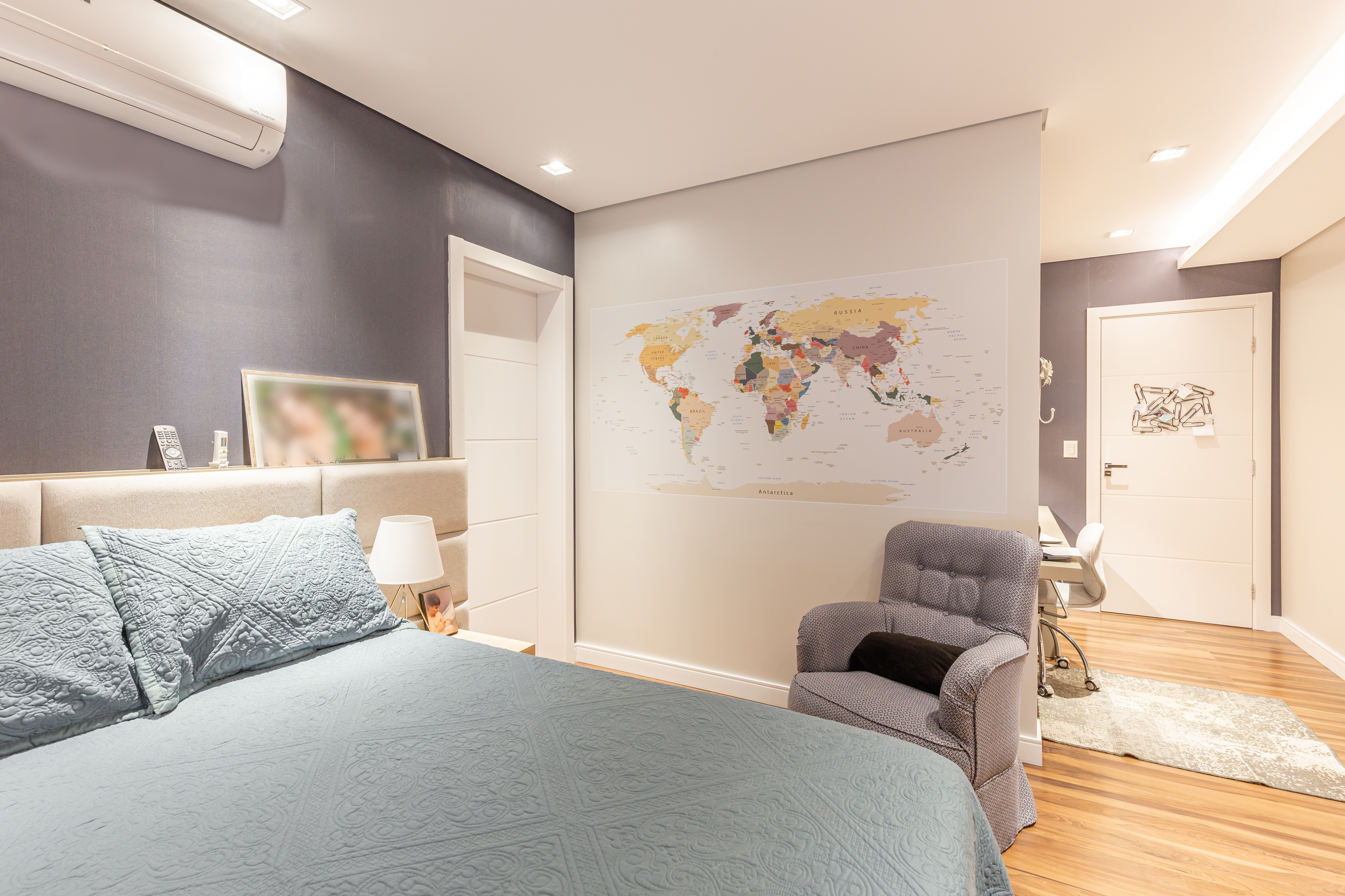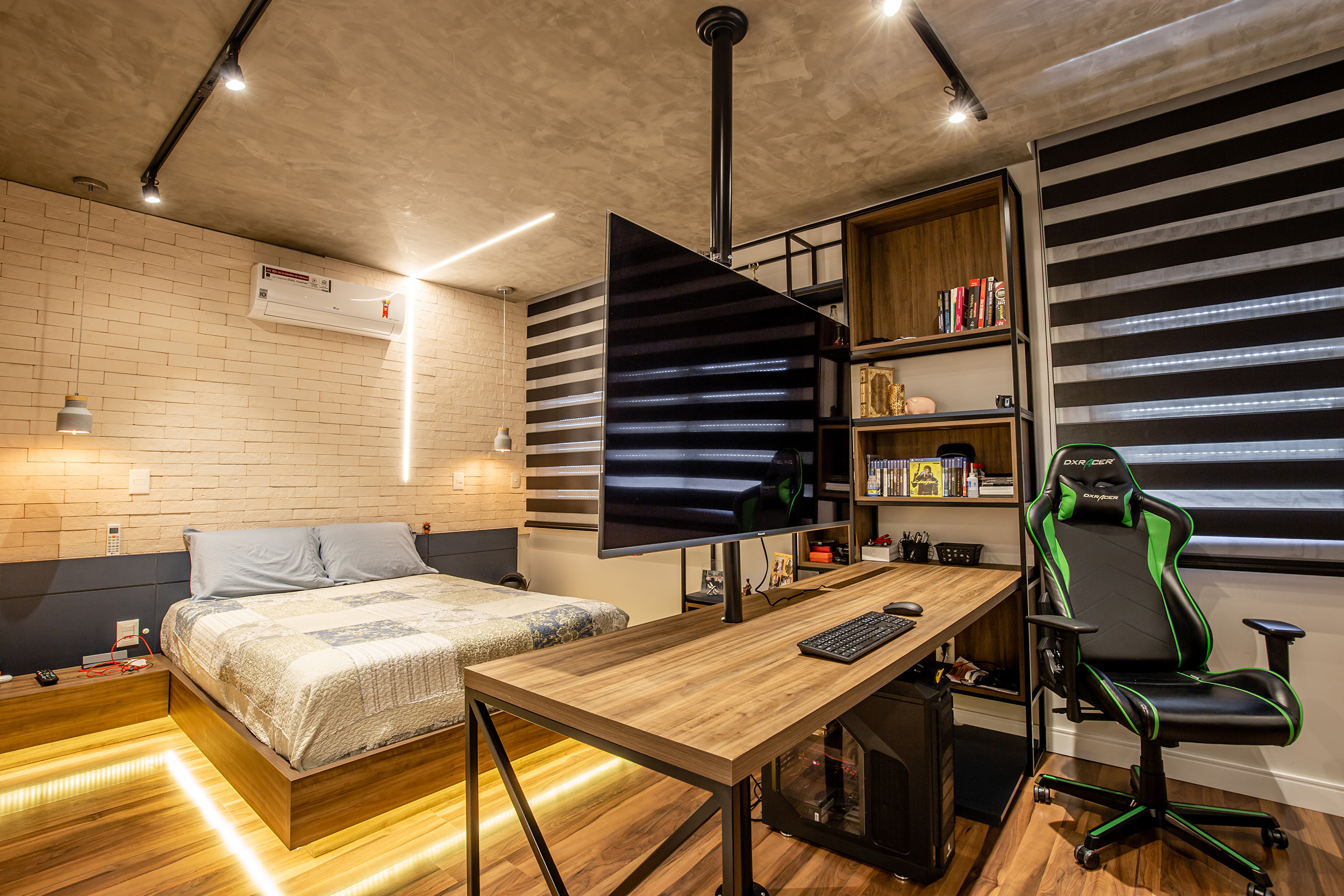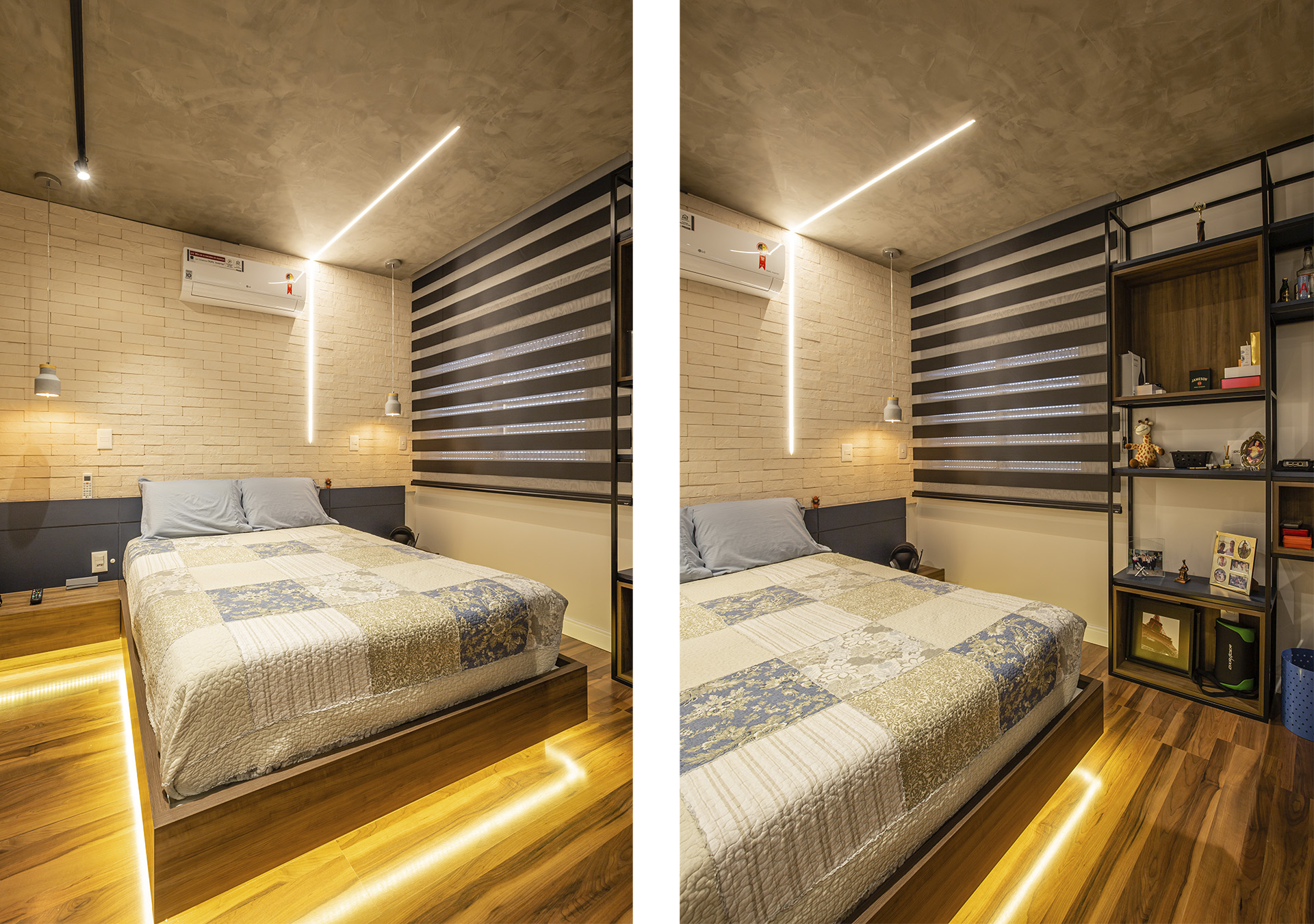 O projeto do apartamento foi remodelado, as 3 suítes foram desconstruídas e transformadas em duas amplas suítes, cada uma com seu programa separado. A suíte L ficou com um ar mais aconchegante e clássico, com um escritório no acesso e um closet separado, deixando a área de dormir somente para dormir e assistir um filme, um espaço para relaxar. Já a Suíte C foi feita com uma linguagem mais jovem, com espaço para armários no acesso do dormitório, um estar e bancada para jogos, além da área de dormir. A propósito, a área de dormir ficou cheia de estilo, com um teto em textura de concreto e iluminação personalizada, com perfil LED e Fita LED. A televisão gira e pode ser usada tanto para os jogos quanto para a área da cama também.