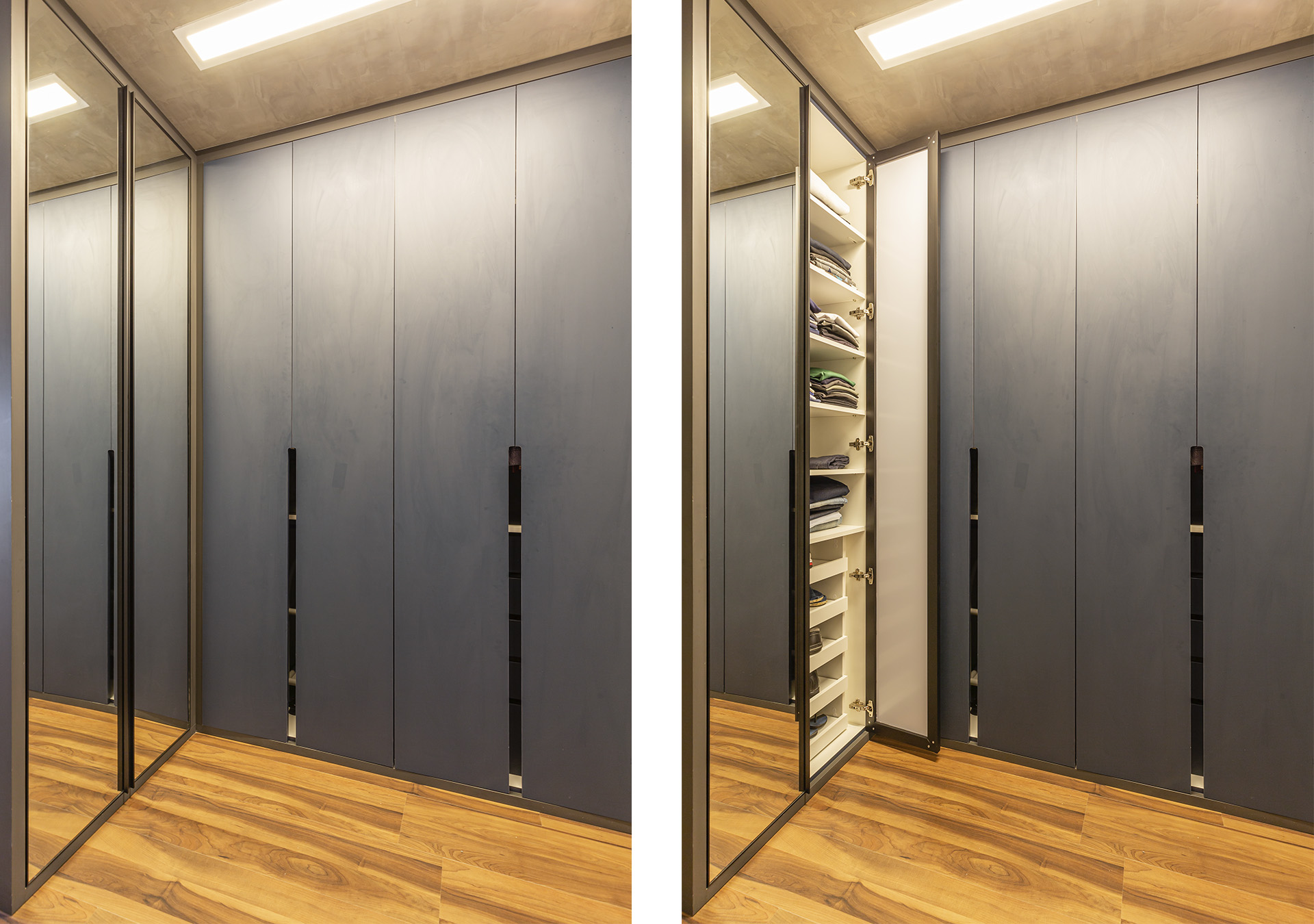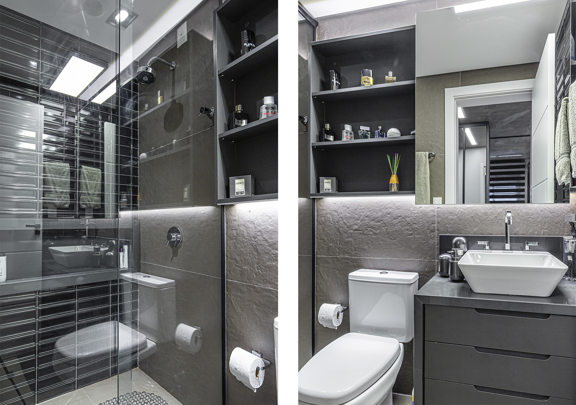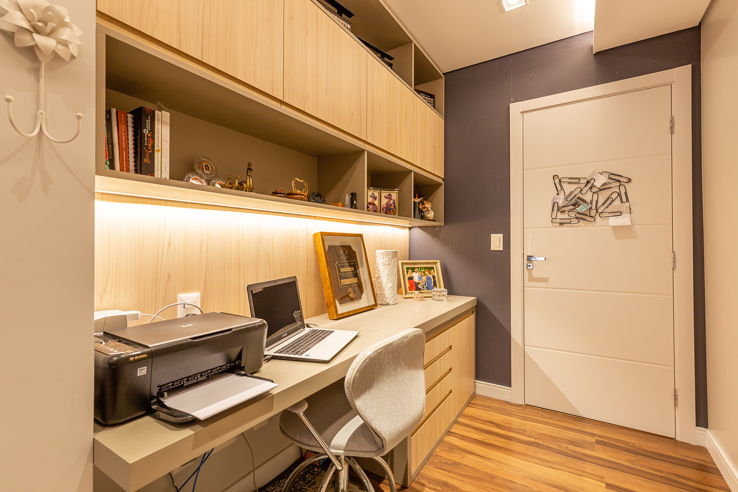 O projeto do apartamento foi remodelado, as 3 suítes foram desconstruídas e transformadas em duas amplas suítes, cada uma com seu programa separado. A suíte L ficou com um ar mais aconchegante e clássico, com um escritório no acesso e um closet separado, deixando a área de dormir somente para dormir e assistir um filme, um espaço para relaxar. Já a Suíte C foi feita com uma linguagem mais jovem, com espaço para armários no acesso do dormitório, um estar e bancada para jogos, além da área de dormir. A propósito, a área de dormir ficou cheia de estilo, com um teto em textura de concreto e iluminação personalizada, com perfil LED e Fita LED. A televisão gira e pode ser usada tanto para os jogos quanto para a área da cama também.