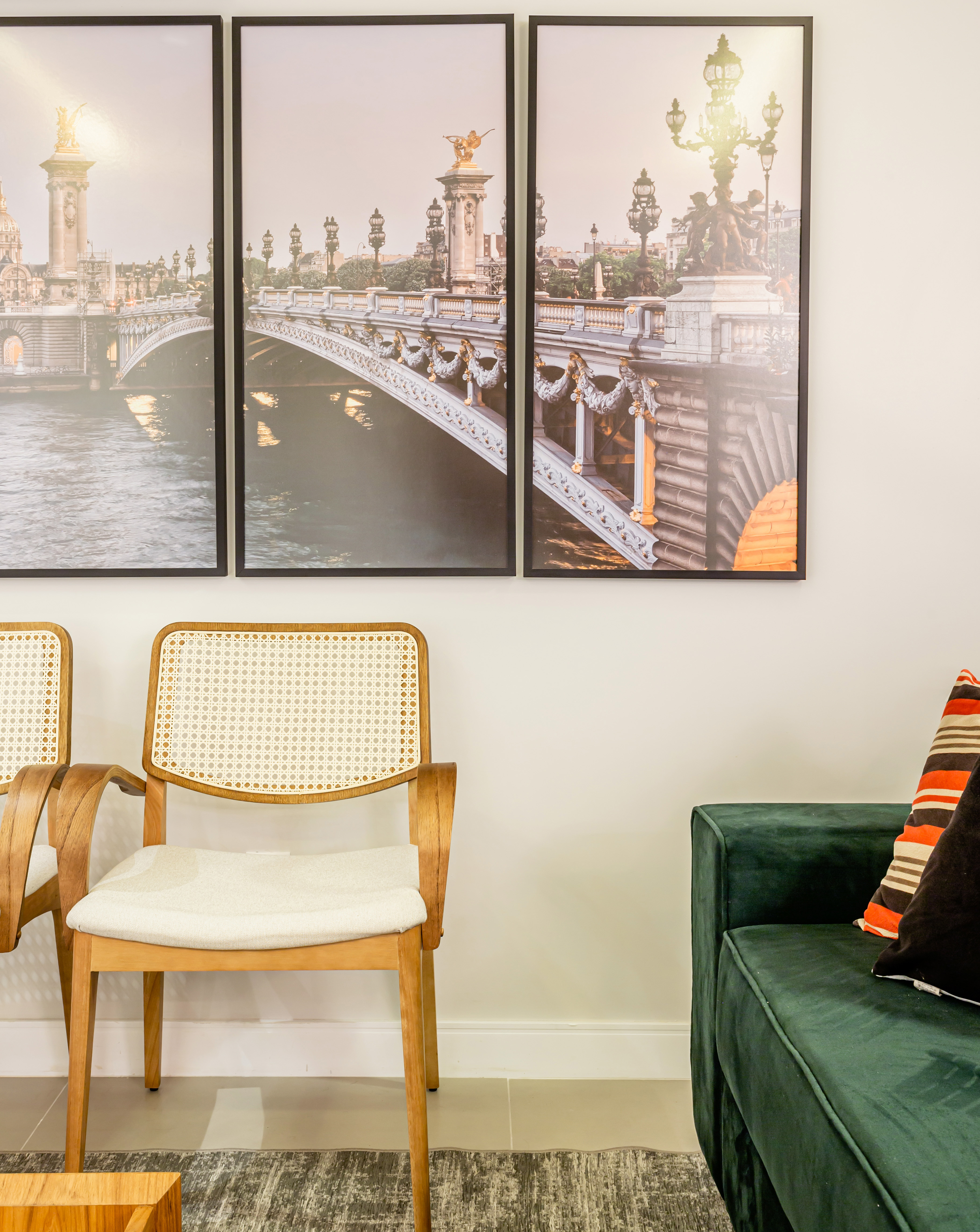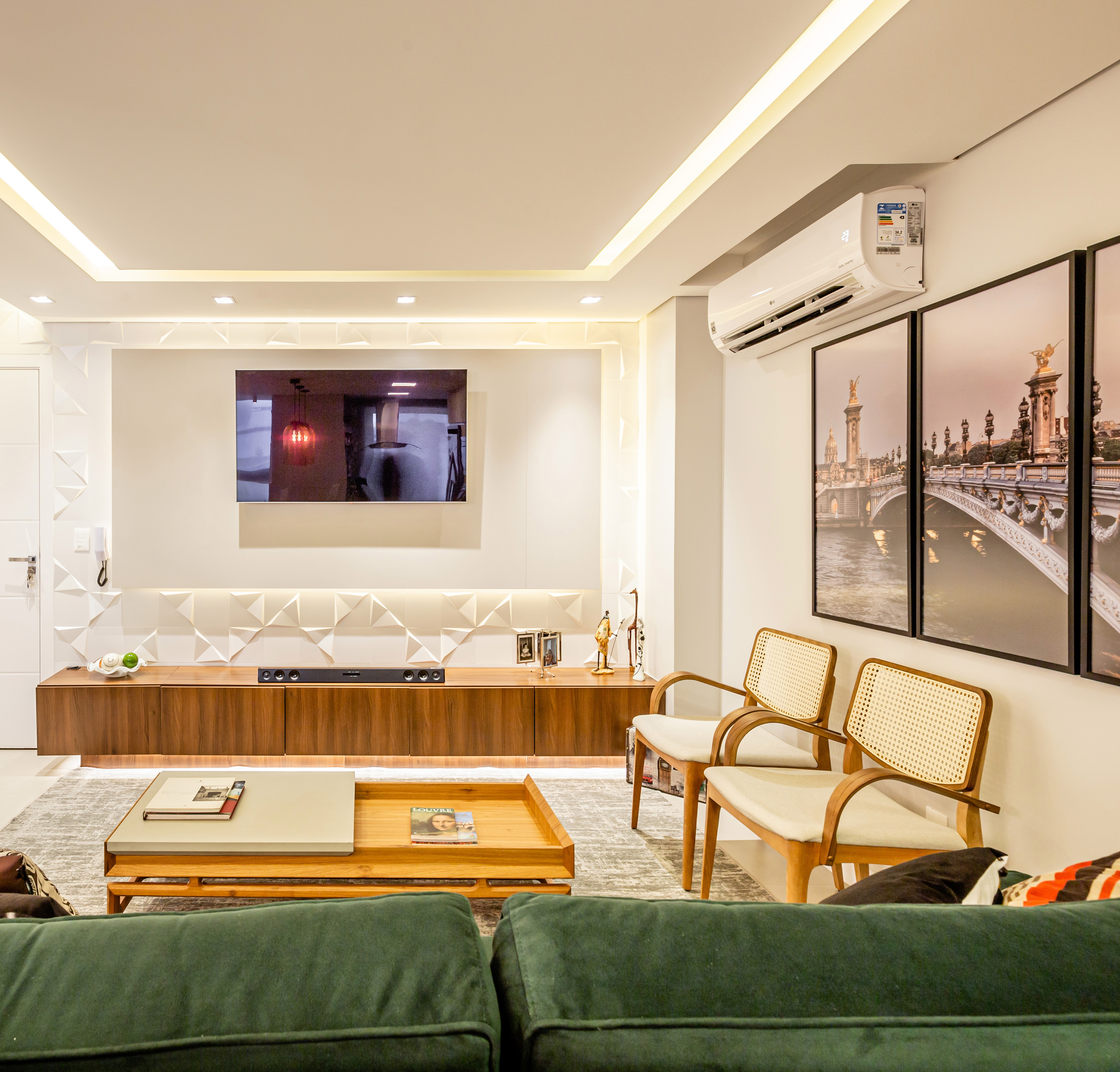 A sacada integrada à sala recebeu uma parede verde, um jardim vertical que faz a conexão com a vista e a cidade. Se quiser ver o apartamento LC por completo, ele já está no nosso site e pode ser visto também no nosso instagram.