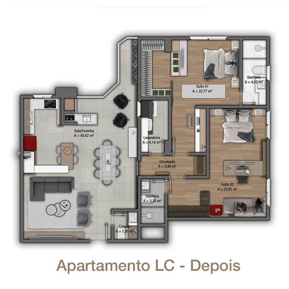 Voltando ao apartamento que concluímos no final de 2020, o apartamento LC, com cerca de 135 m², que possuía 3 suítes, uma ampla área social integrada com a cozinha e uma sacada com churrasqueira. Esse é um apartamento de alto padrão para uma família, com uma suíte maior para o casal e duas suítes para os dois filhos. Mas o padrão dos clientes não era esse, os clientes eram mãe e filho, que vivem juntos a anos, se conhecem, compartilham a vida, mas ambos queriam privacidade para suas atividades.