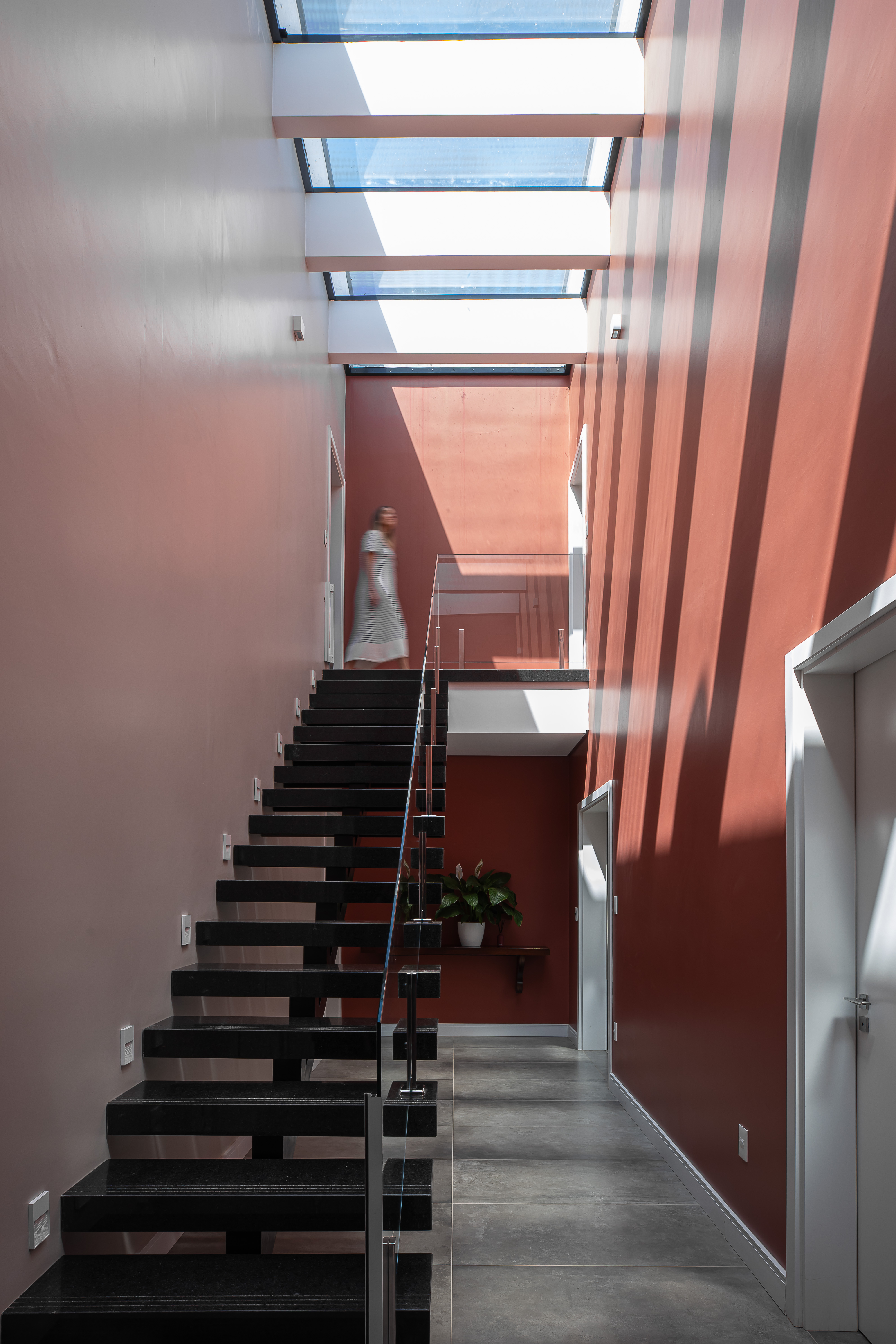 É por esse átrio que se acessa a casa, através da via de menor movimento, e também é por ele que se faz o acesso ao segundo pavimento da residência, onde fica toda a área íntima, com todos os dormitórios voltados ao norte, a melhor insolação para essa latitude. Nessa área íntima ficam um corredor com copa e rouparia, quatro dormitórios, sendo duas suítes, e um estar íntimo. Este dá acesso a um terraço, um pátio íntimo, pelo qual é possível visualizar a Avenida e o pátio interno da residência.