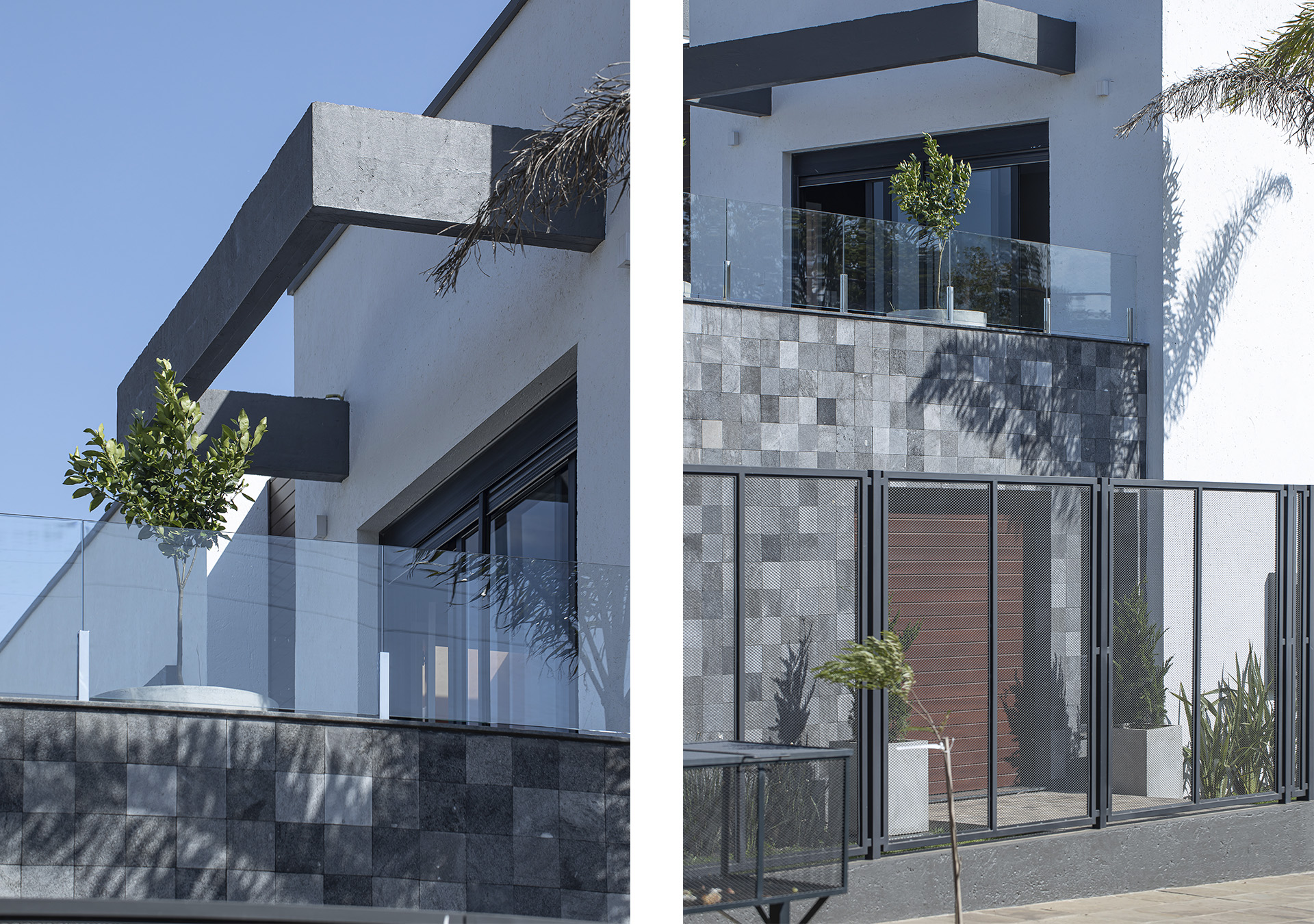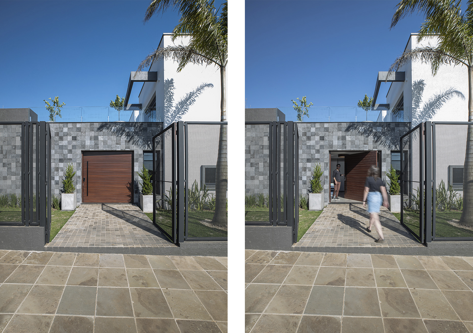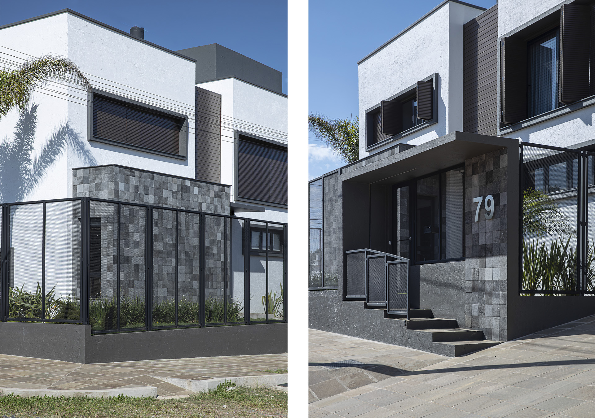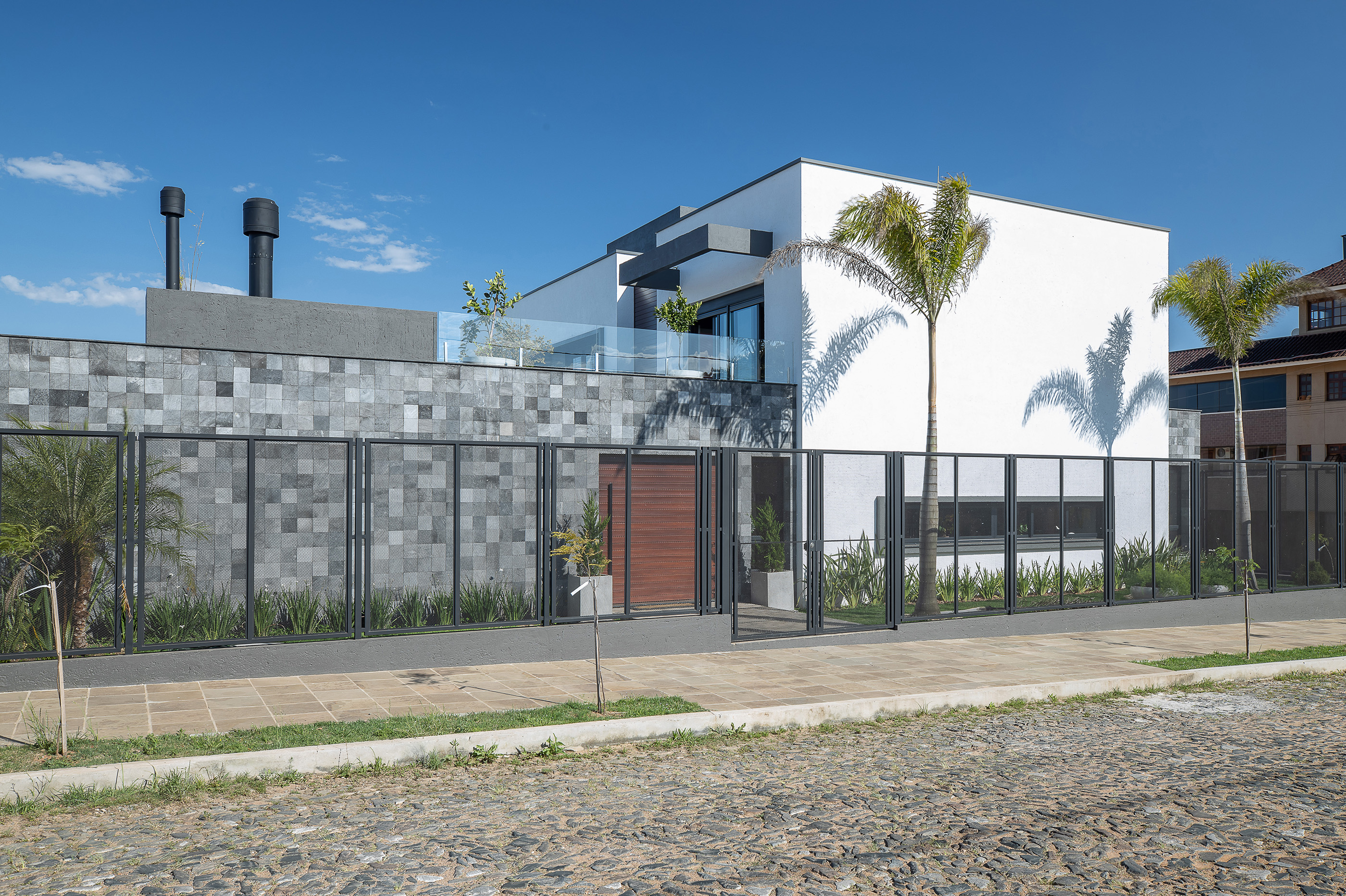 O terreno da residência é uma esquina, entre uma avenida e uma via de apenas uma quadra, e isso, somado à orientação solar, definiu a distribuição, os acessos, e a relação da casa com cada uma das vias. A frente para a rua de menor movimento é norte, melhor insolação para a nossa região. Além disso, a rua é calma e silenciosa, é por ela que ocorre o encontro com o bairro, e assim, é por ela que ocorre o acesso principal e de serviço da residência. Já a Avenida possui maior fluxo, mais ruído e maior visibilidade, é onde a cidade encontra a residência, e por isso esta possui uma relação mais discreta com essa fachada.