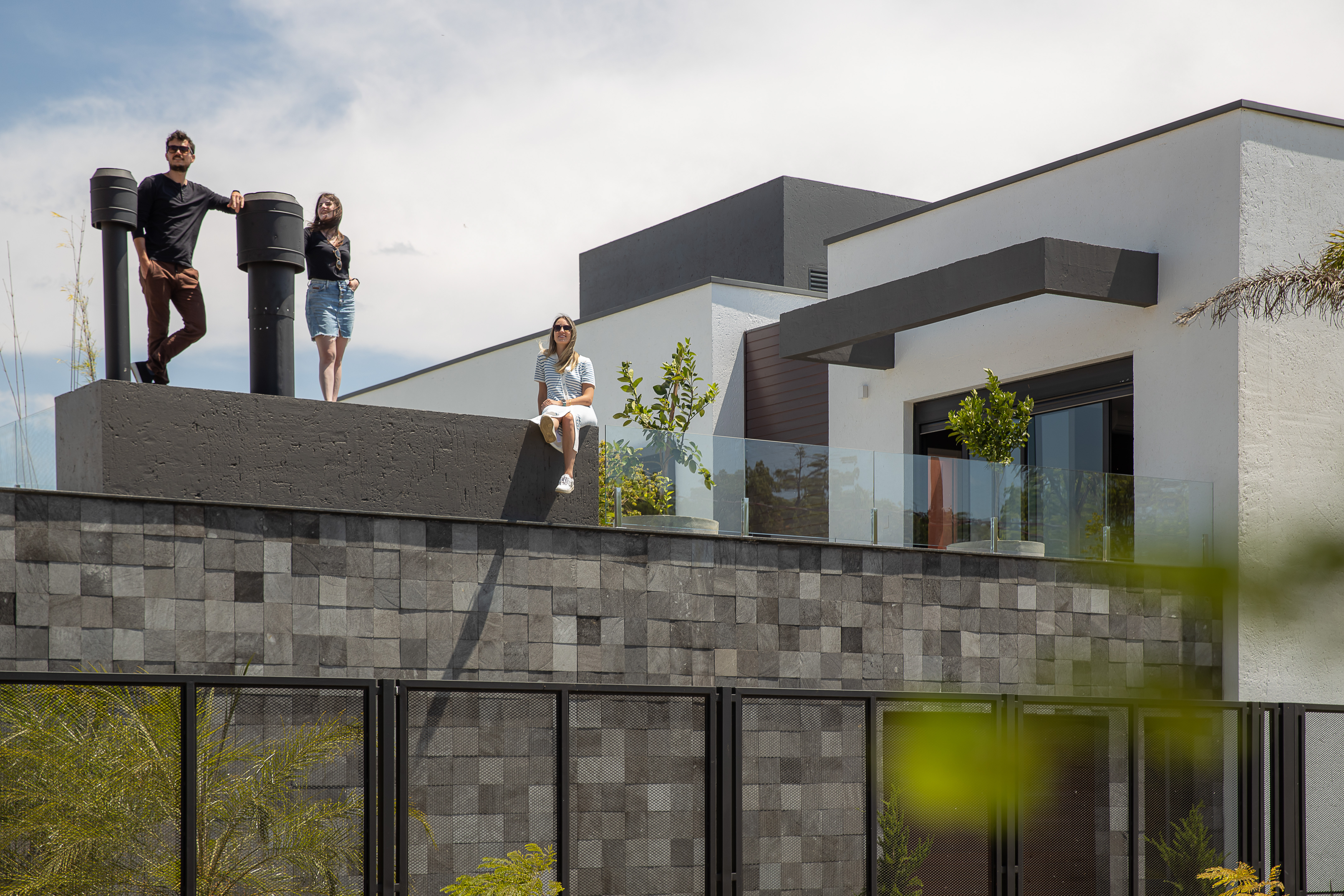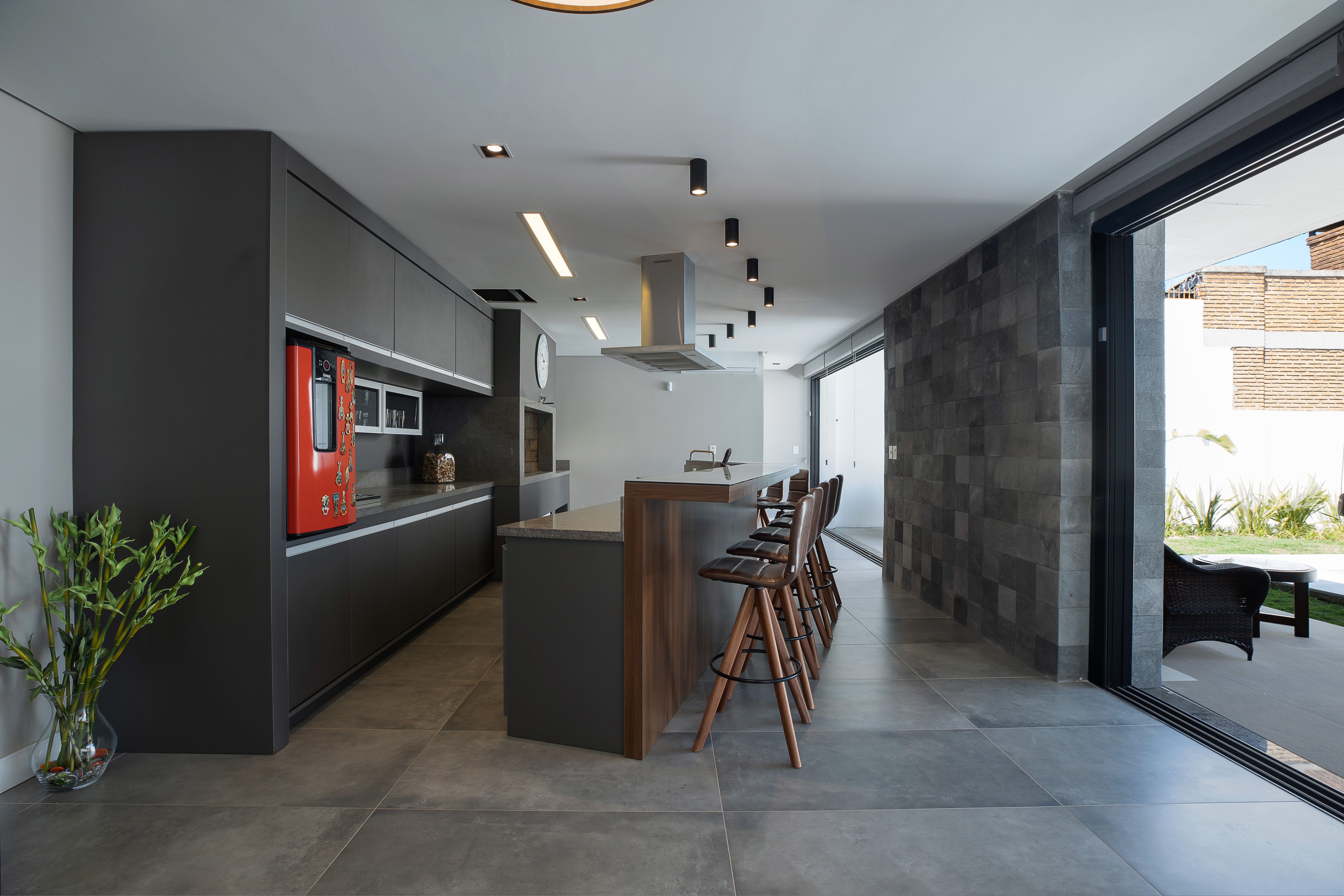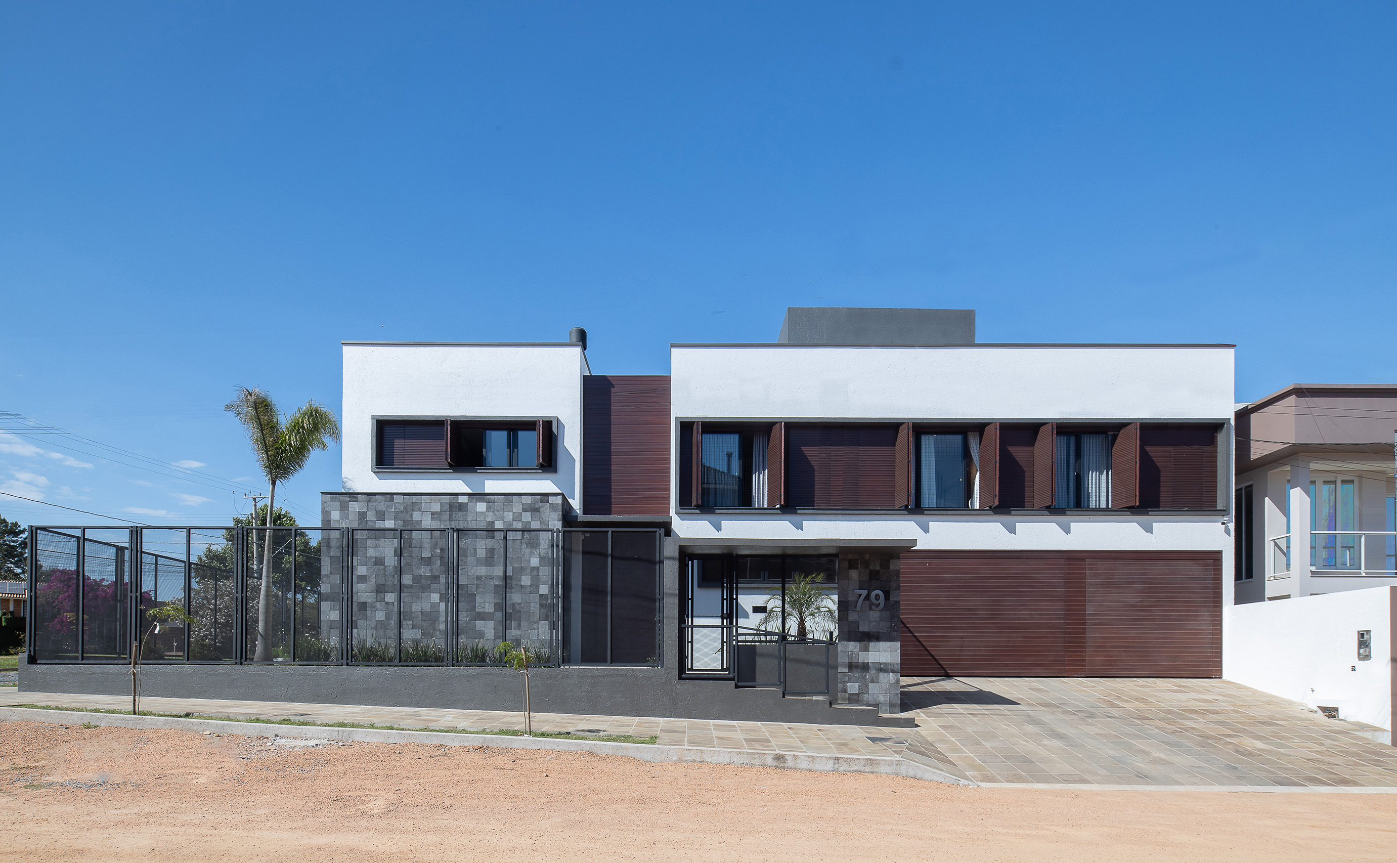 A esquina e a orientação solar definiram o projeto, que possui três principais setores – o setor de serviço, o setor social e o setor íntimo. O setor social concentra-se quase todo na fachada da avenida, é ali que fica um acesso exclusivo ao espaço gourmet, que pode ser usado individualmente ou conectado à área social da casa. O setor de serviço fica na outra fachada, com garagem, lavanderia, cozinha e dependência de empregada. Eles se conectam por um amplo átrio, marcado em todas as fachadas com revestimento de madeira. Este átrio é coberto com vidro, como um pátio coberto.