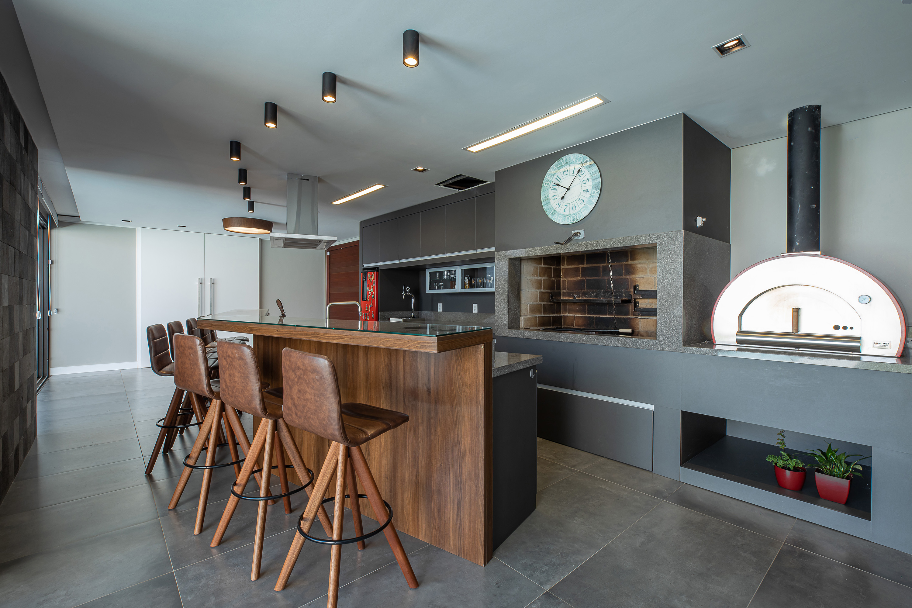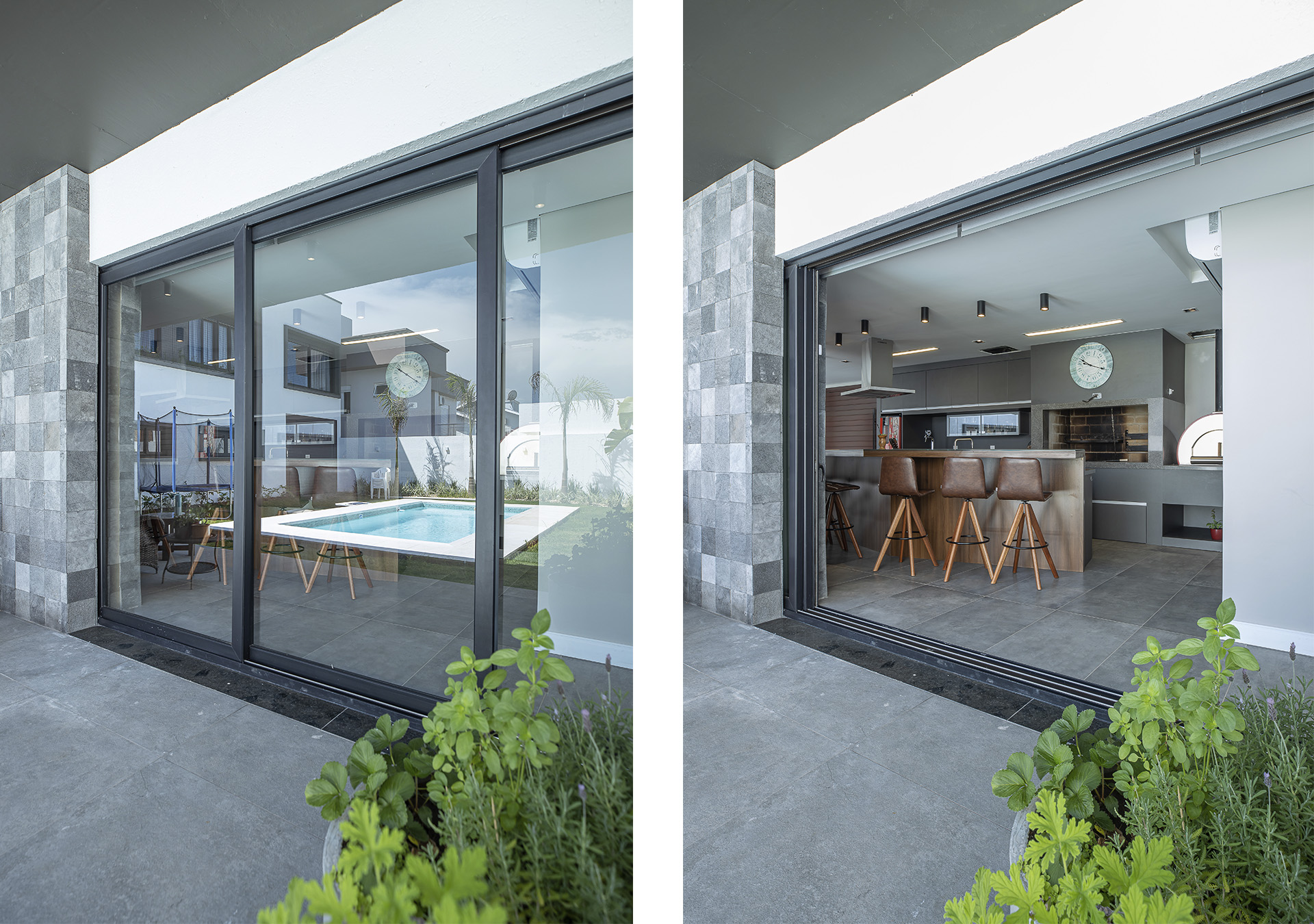 O pátio possui piscina e ampla conexão com o espaço gourmet, onde as portas e janelas correm para dentro da parede com revestimento em pedra, transformando o espaço gourmet em uma ampla varanda.