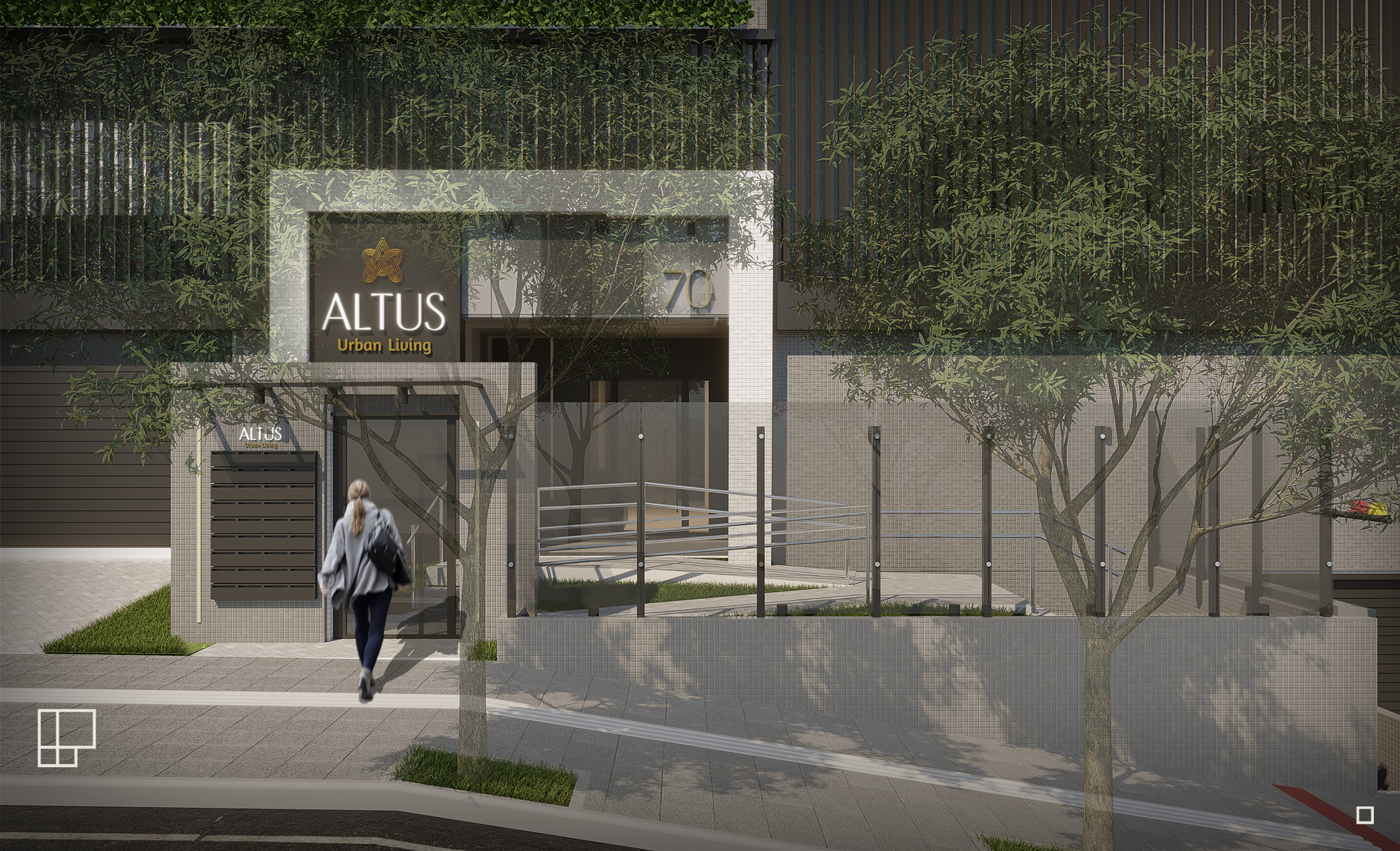 A conexão com a microregião também é feita no pavimento que toca o solo, no térreo. O fechamento do lote é parcial, entregando parte do paisagismo à rua, onde está previsto o plantio de vegetação arbórea que dê uma cobertura verde ao nível do pedestre. Além disso, o fechamento parcial conta com um espaço de lazer dos moradores, um espaço com bancos, que viabiliza a conexão entre moradores e a rua, ampliando a atmosfera de bairro.