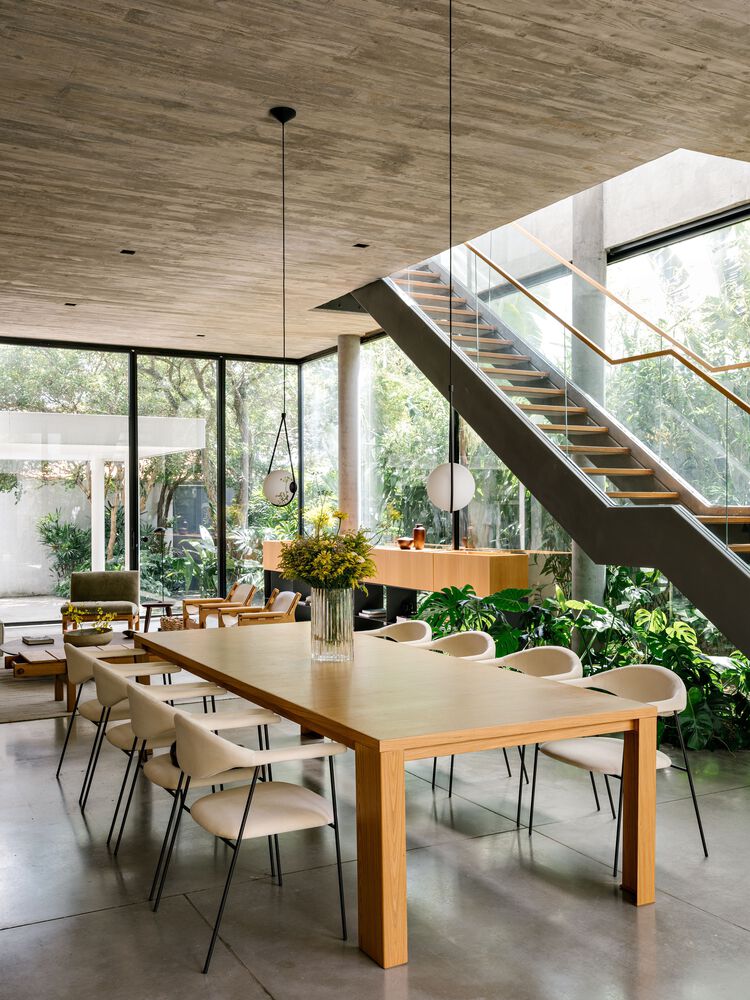 “Nessa casa, destacam-se as soluções adotadas pelos projetistas para demandas comuns em projeto de residências unifamiliares: ambientes da área social que possam ser integrados ou não, conforme a dinâmica dos moradores. Aqui, além da conexão com o espaço externo da casa, a cozinha é um ambiente que pode estar integrado no momento de receber amigos e isolado quando se fizer necessário, utilizando-se de uma disposição que mantém uma continuidade e fluidez visual. A materialidade e o paisagismo também são pontos fortes, trazendo a natureza e o conforto para a residência..“