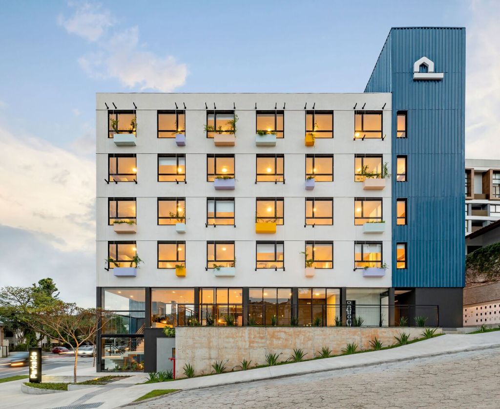 “O edifício de uso misto distribui o programa se aproveitando do desnível considerável do lote. No subsolo fica garagem e acesso principal, térreo com áreas comuns, espaço comercial e quatro pavimentos tipos com apartamentos estúdios. A edificação de estrutura mista (base em concreto armado e torre em light wood framing) traz uma modulação da fachada com as esquadrias resultante do sistema painelizado com tempo total de execução da torre de apenas 10 dias e 14 pessoas no canteiro de obras. Por estar em uma região próxima à Universidade Federal de Santa Catarina e por ser um lote de esquina, a edificação, além de uma obra com sistema construtivo inovador e industrializado, entrega para a cidade gentilezas urbanas por não tem muros e dispor de áreas verdes que podem ser aproveitadas por moradores e transeuntes.“