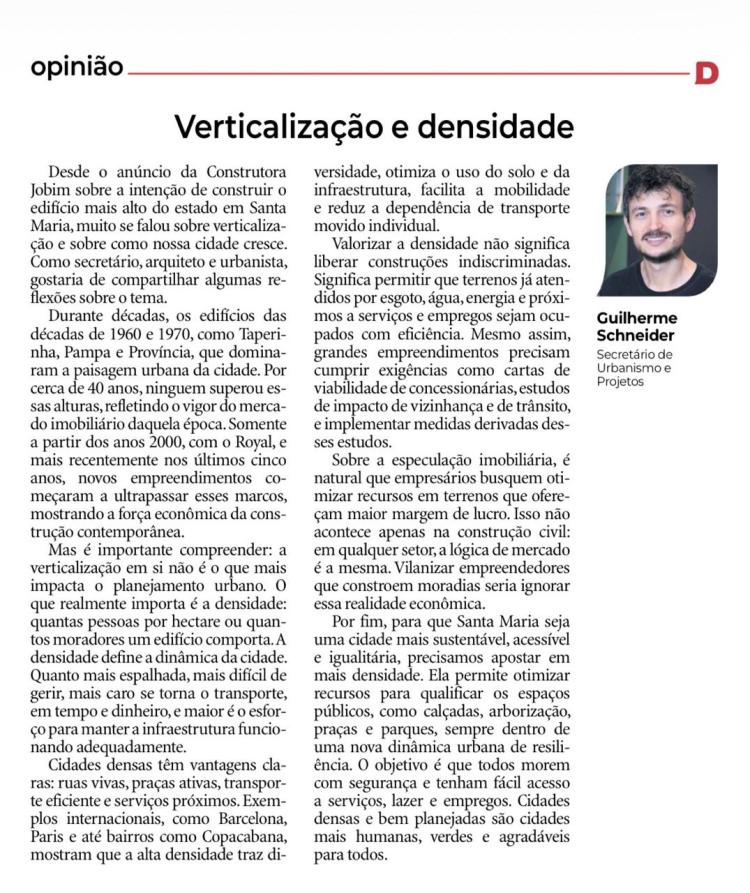 Desde o anúncio da Construtora Jobim sobre a intenção de construir o edifício mais alto do estado em Santa Maria, muito se falou sobre verticalização e sobre como nossa cidade cresce. Como secretário, arquiteto e urbanista, gostaria de compartilhar algumas reflexões sobre o tema. Durante décadas, os edifícios das décadas de 1960 e 1970 — […]